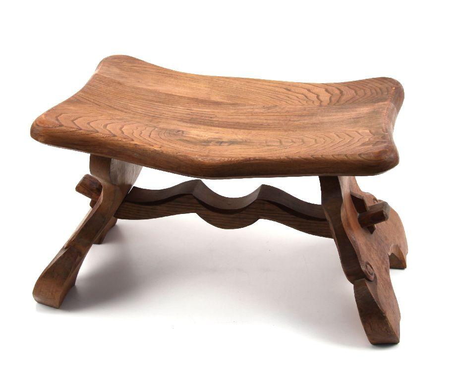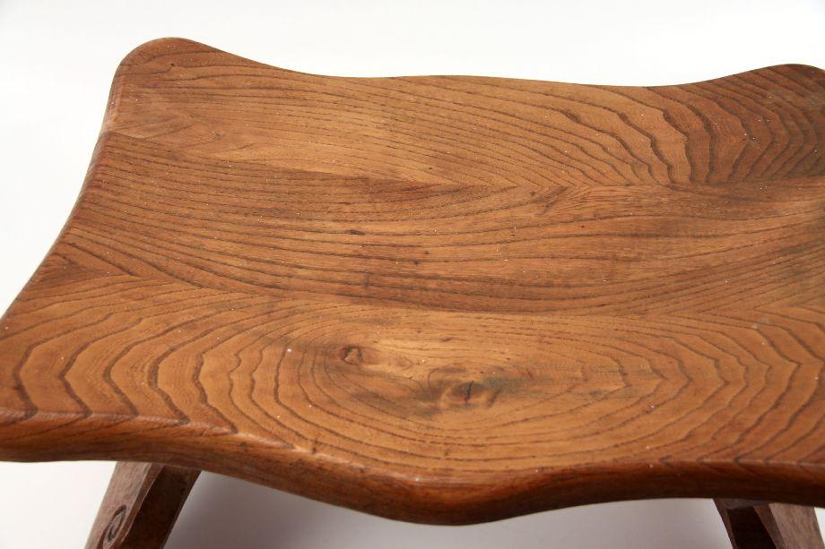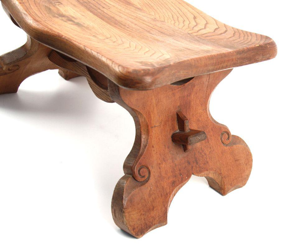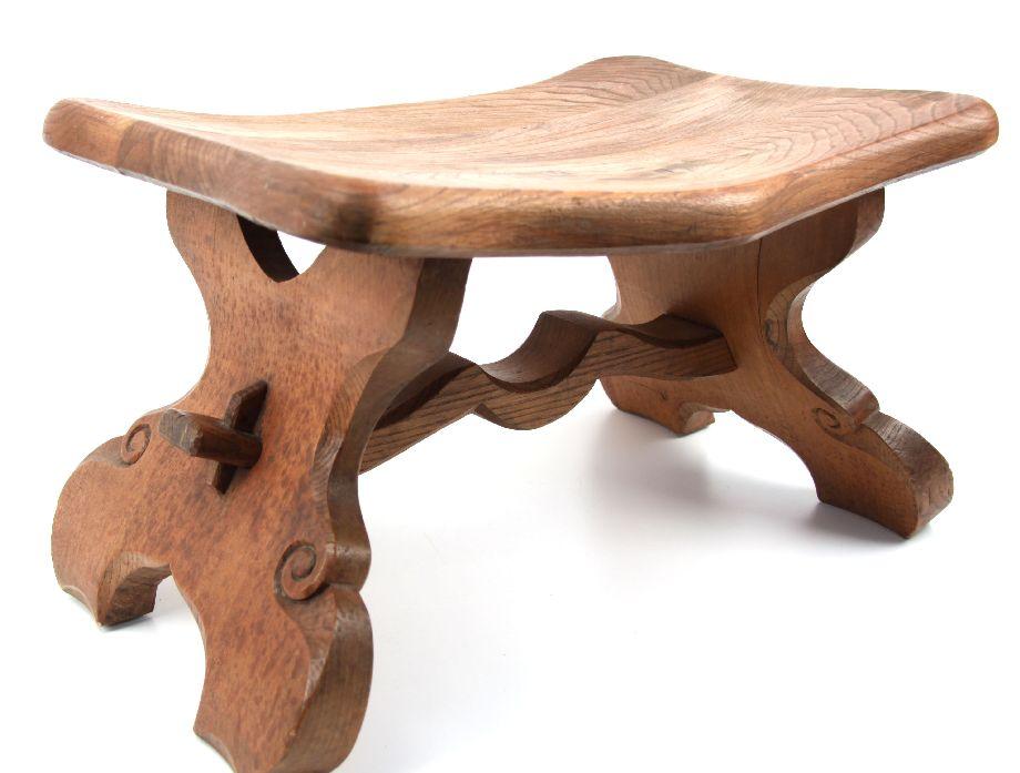 A sturdy foot stool made of old growth oak. Mortise and tenon construction with the stretcher having a thru-mortise. Carved scroll work to legs. Heavy carved curved top. Very good condition with nice patina t original finish.