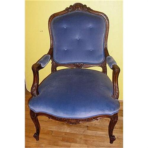 Here is a nicely carved walnut armchair. It features blue velvet upholstery. This chair has a rich finish dark walnut frame. It is in fine condition and measures 27" wide by 30" deep and is 39.5" tall.