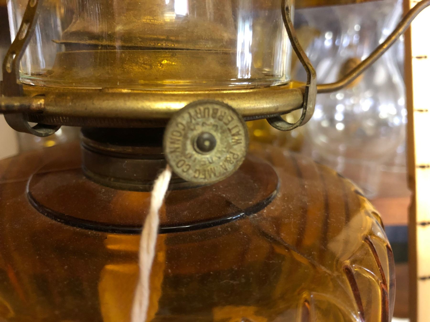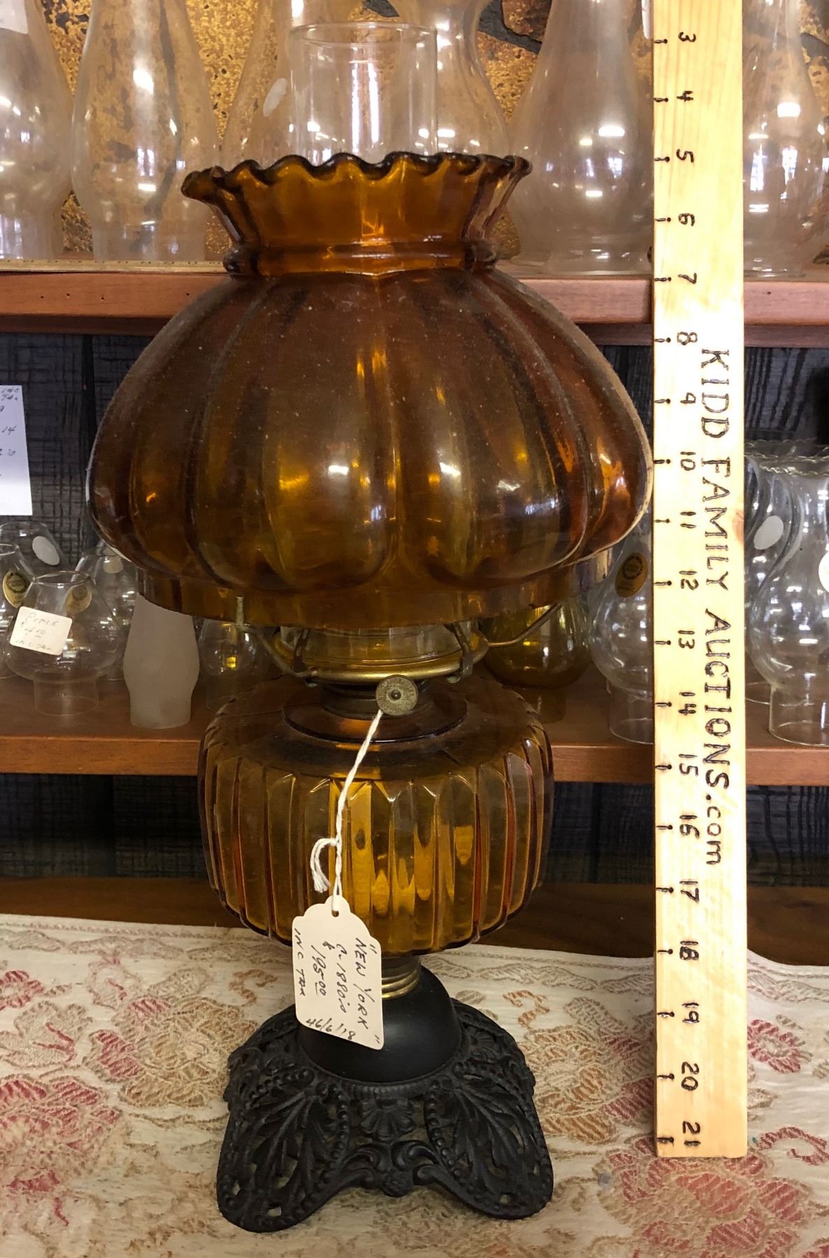 ANTIQUE CAST BASE AMBER GLASS OIL LAMP - P&A MFG CO