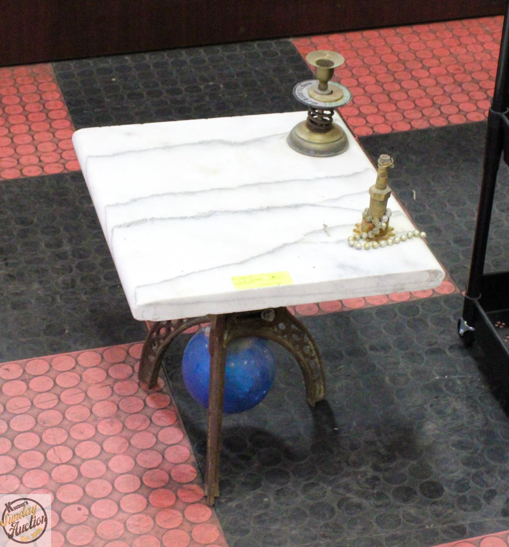 SMALL MARBLE TOP TABLE WITH CAST IRON LEGS- FIXTURES ARE ATTACHED TO TABLE **ALL ITEMS MUST BE REMOVED BY 5PM SATURDAY, NOVEMBER 29TH 2025. ALL REMAINING ITEMS WILL BE SUBJECT TO A $6.00 PER DAY STORAGE CHARGE. ANY ITEMS REMAINING AFTER MONDAY, DECEMBER 15TH 2025 WILL BE CONSIDERED FORFEITED. NO REFUNDS WILL BE ISSUED FOR FORFEITED ITEMS. TO SCHEDULE A PICK UP APPOINTMENT CLICK HERE