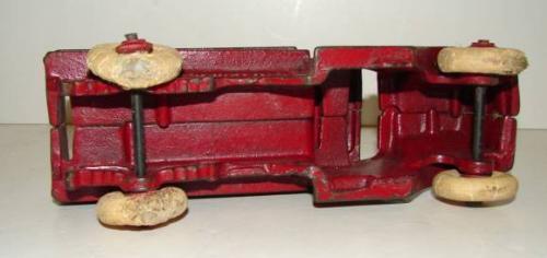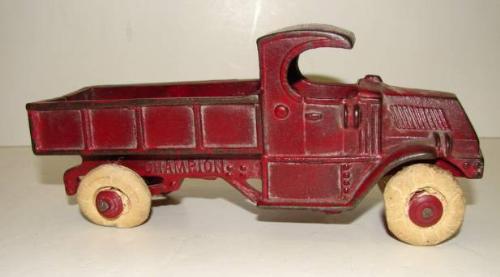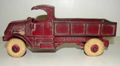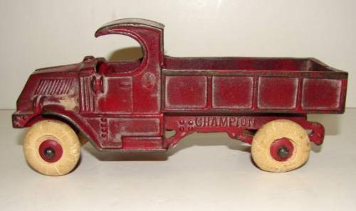 ANTIQUE CAST IRON TRUCK WITH ORIGINAL RED PAINT AND WHEELS. Marked “Champion” on sides. Minor wear to paint and wheels.