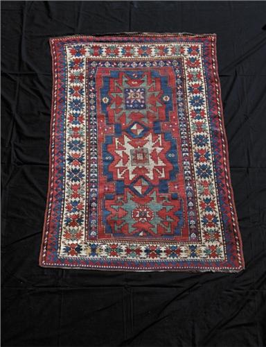 ANTIQUE CAUCASIAN ORIENTAL RUG. Center red field with three star like medallions. Multiple borders in colorful blue, red and ivory. SIZE: 84in. x 49in.. CONDITION: Good. Some wear to pile. 9-26283