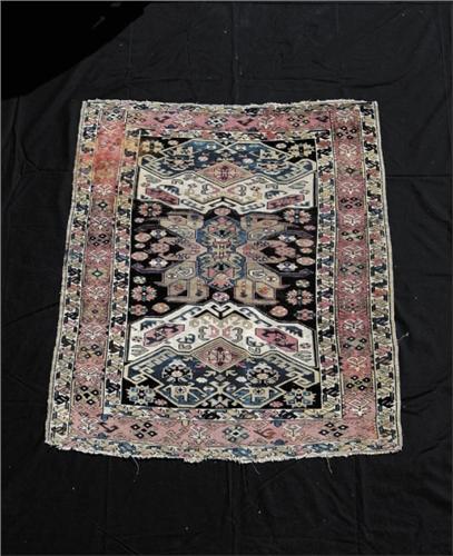 ANTIQUE CAUCASIAN SCATTER RUG. Black field with three medallions and multiple borders. Colors of blue, ivory, black, red and green. SIZE: 59in. x 45in.. CONDITION: Fair with stain, color bleeding and wear. 9-26180