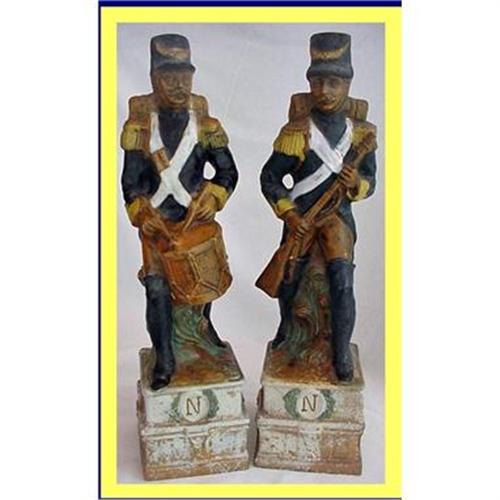Pair of antique Royal military figural candlesticks in the form a drummer and rifleman respectively. Made Germany, possibly by Herend.<BR>Measure 12 1/2inches high each.<BR>Each soldier stands on a white, antique-style pillar moulded and gilded to look Classic, with an N in a green wreath of laurels - possibly for Napoleon? The drummer marches forward as he beats a tatto; the rifleman strides forward. Both have large, German military moustaches and the features on their faces are very well modelled. Backpacks, epaulettes, garlanded hats also well modelled and subtlely coloured.<BR>The candle would be placed in the hat of the soldier.<BR>Underneath each pillar has a variety of embossed and engraved marks: A crown and shield within a laurel wreath, enclosed in a circle, very likely the mark of Herend. Incised letters and numbers. <BR>Very good condition.