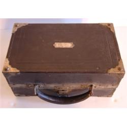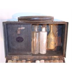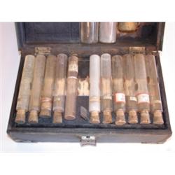 ANTIQUE CHEMIST CASE. Consists of leather case and 47 test tubes, two glass bottles, and one metal ware bottle. Inside of case is marked "St. Louis Leather Works". Case: 5.5" H, 11" W, 6.75" D