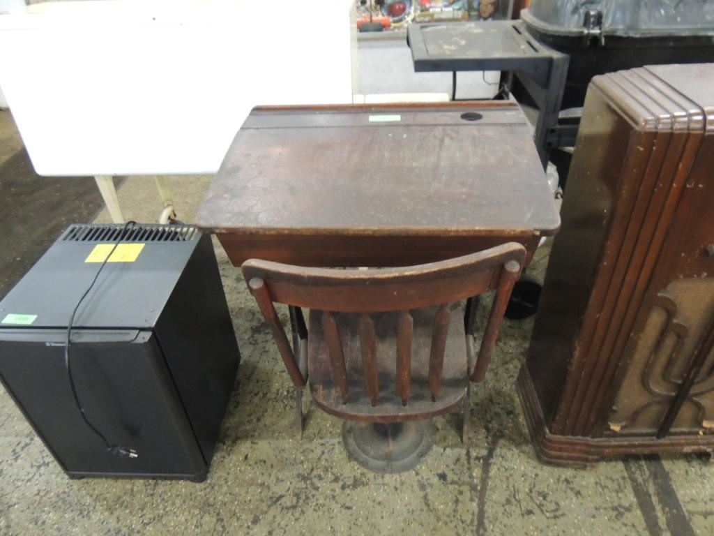 SCHOOL HOUSE DESK WITH CHAIR STORAGE AND OPEN TOP SCHOOL DESK AS SHOWN SEE PHOTO FOR MORE DETAILS.