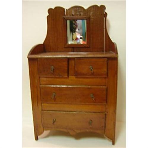 ADORABLE IS A GOOD DESCRIPTION OF THIS SMALL DOLL DRESSER. IT WAS LOVINGLY MADE OUT OF WOODEN CIGAR BOXES. SOMEONE DATED ONE OF THE DRAWERS 1924 AND THIS WAS PROBABLY AFTER THE CHEST WAS FINSHED. CUP HOOKS FORM THE DRAWER PULLS. IT WAS IMAGINATIVELY AND CHARMINLY DESIGNED. IT HAS BEEN WELL CARED FOR OVER THE YEARS AND IS IN GOOD CONDITION.