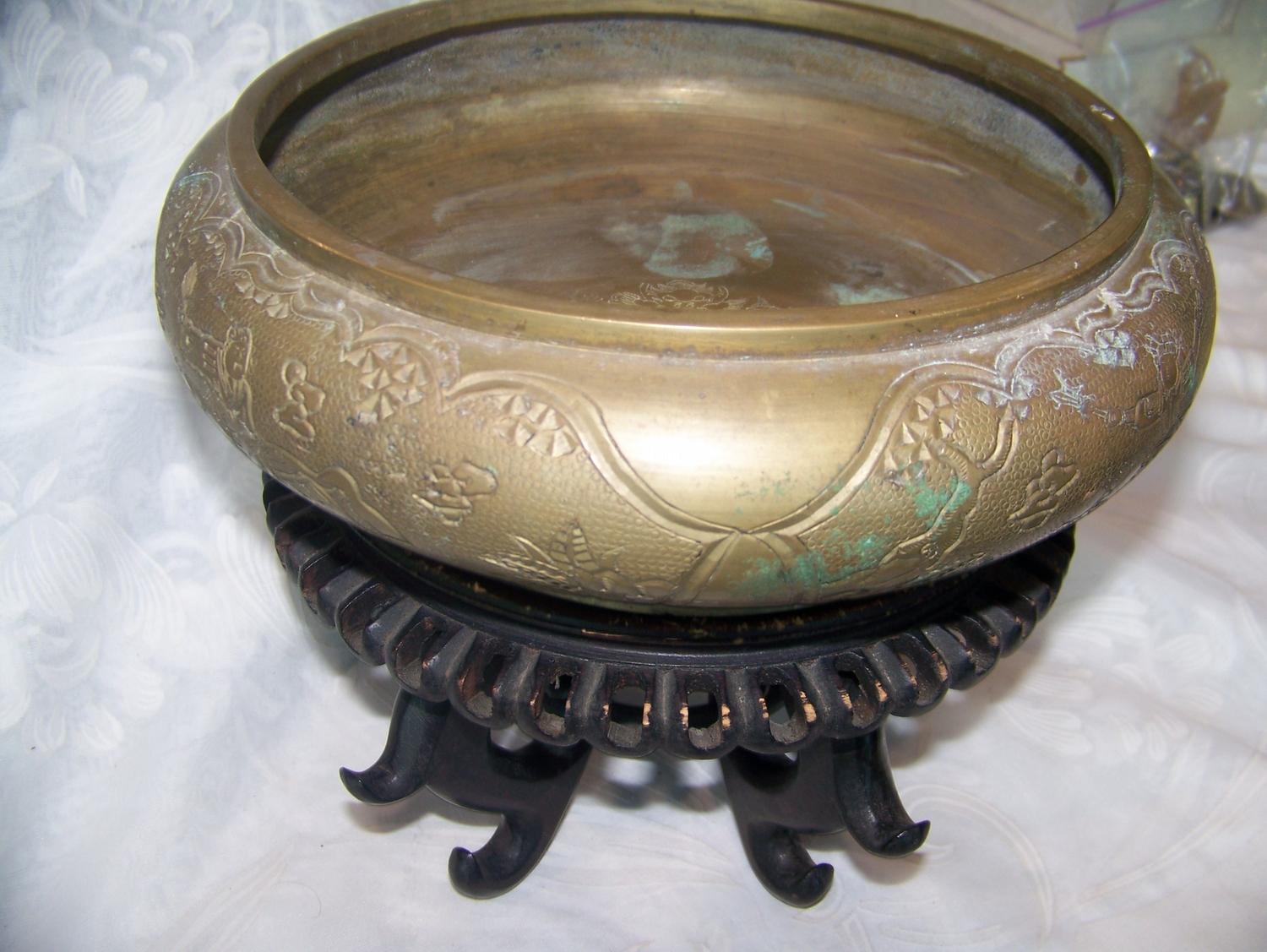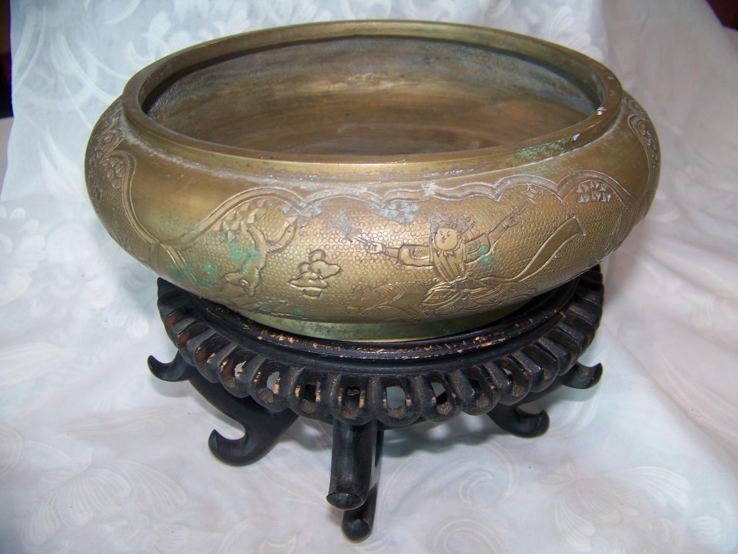 ITEM HAS NOT BEEN AUTHENTICATED, HOWEVER SELLER PRESENTED DESCRIPTION & ITEM HAS BEEN DESCRIBED AS AN BRASS LILY BOWL WITH A SCENE DEPICTING IMPERIAL HORSES & RIDERS, MANDARIAN IN DRAGON BOAT atop