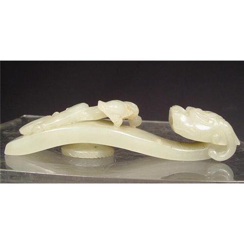 Antique, Qing Dynasty, pale celadon jade belt hook. Details: carved as a sinuous chilong clutching lingzhi spring in its teeth facing the dragon ?head terminal. Dimensions; length: 9 cm (3 ½ in), width: 2,5cm (1in). Condition: broken head of chilong otherwise in good condition.