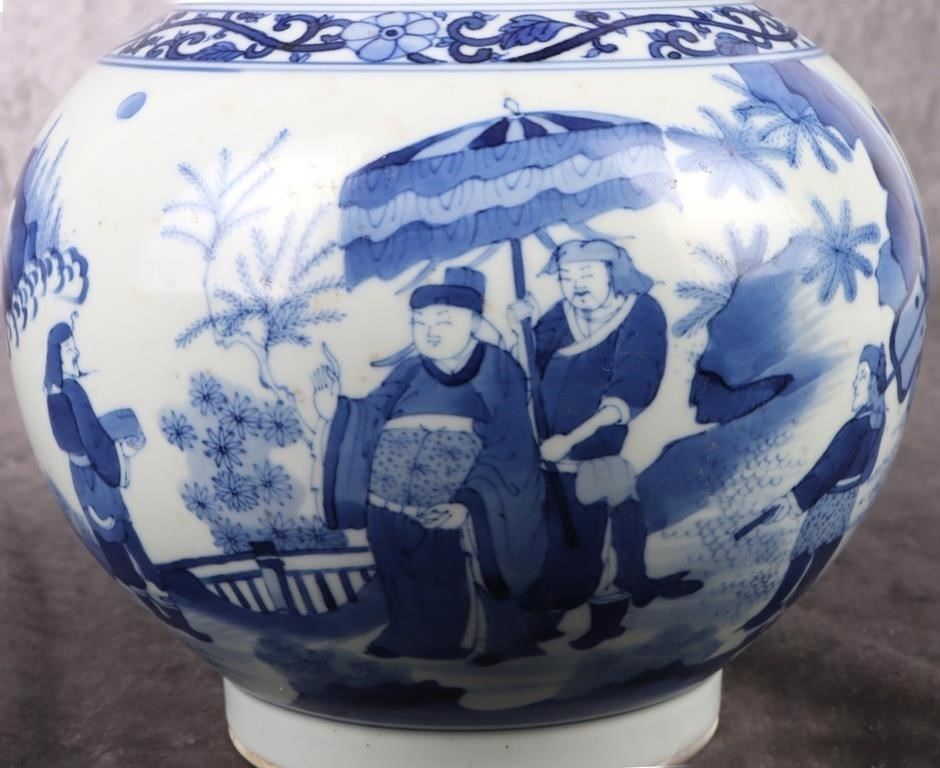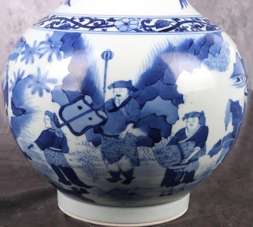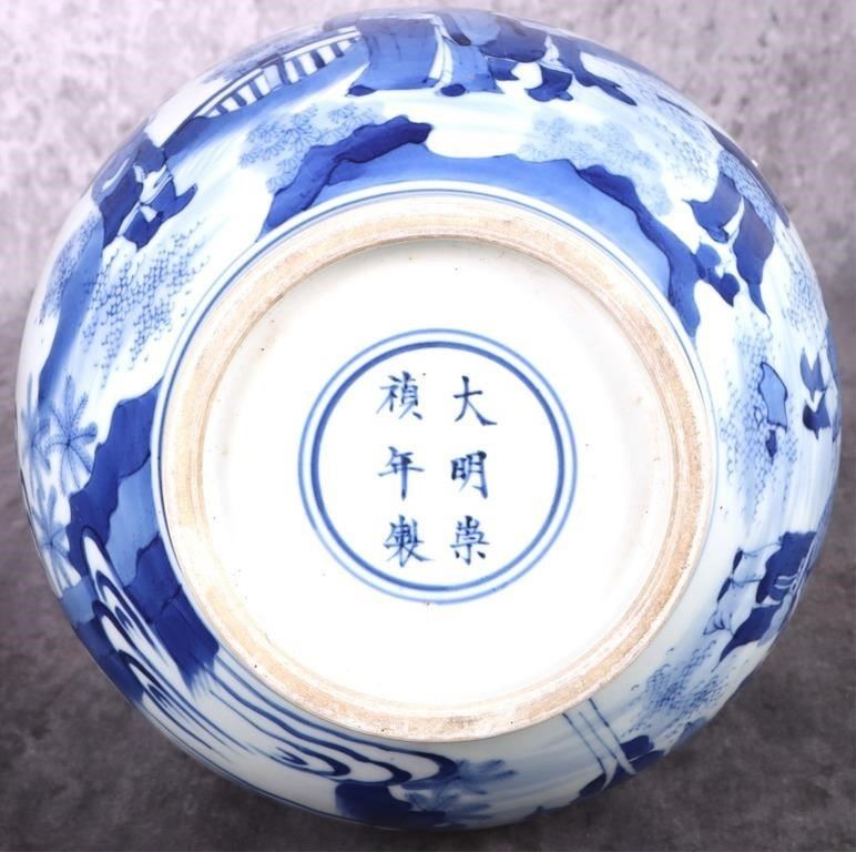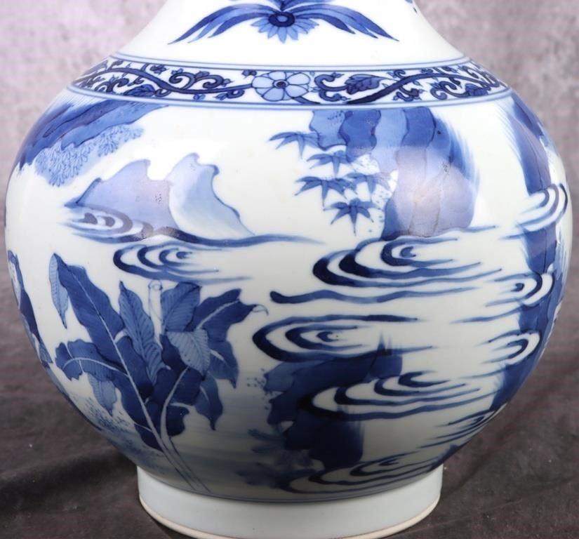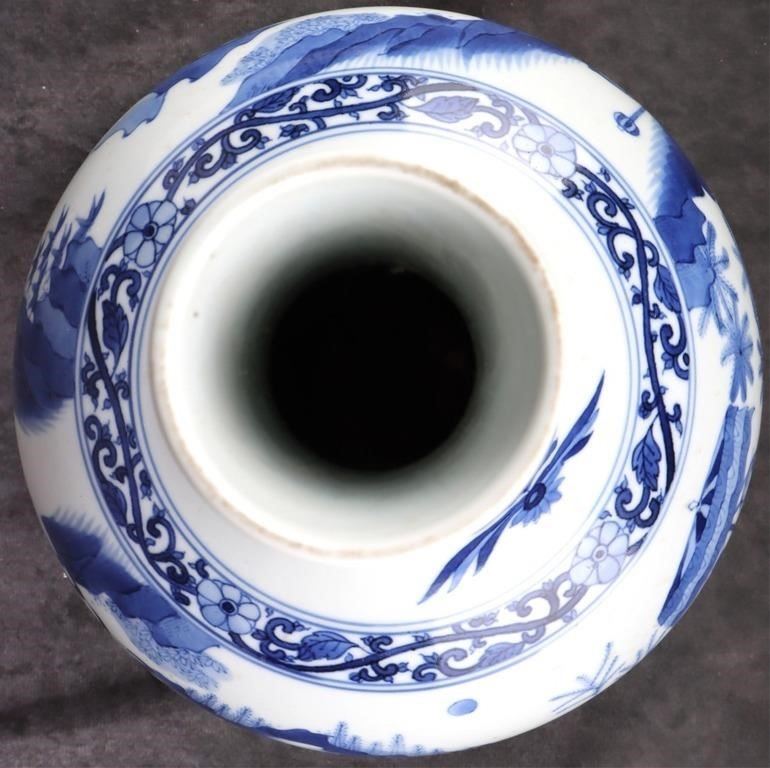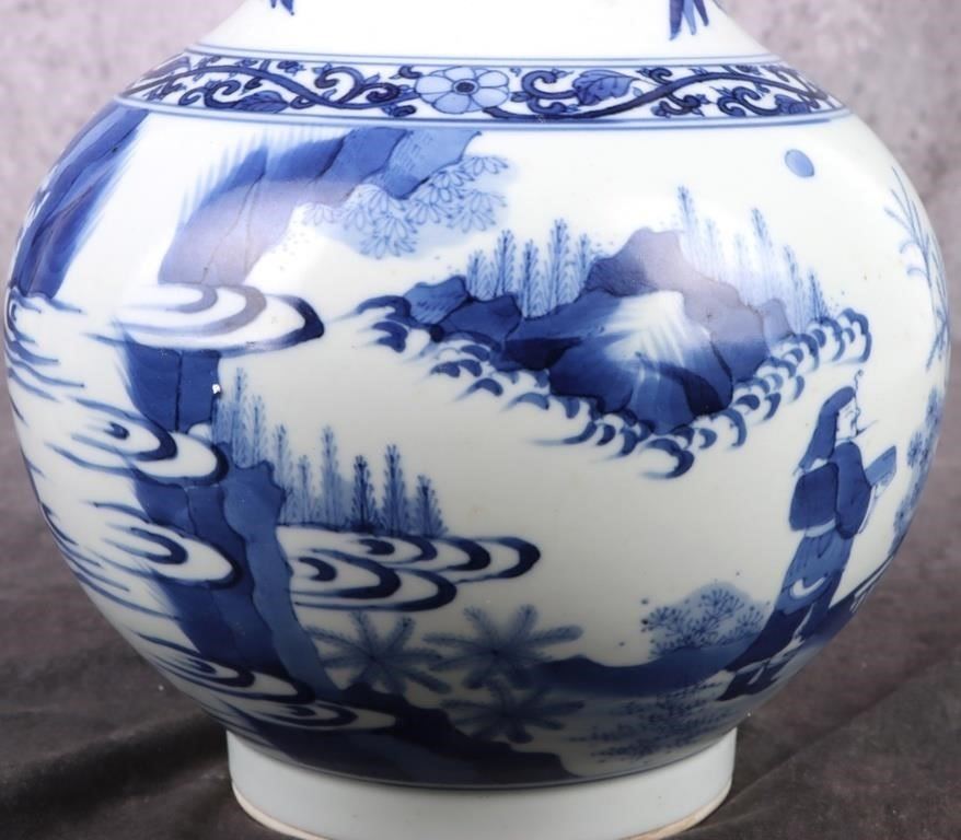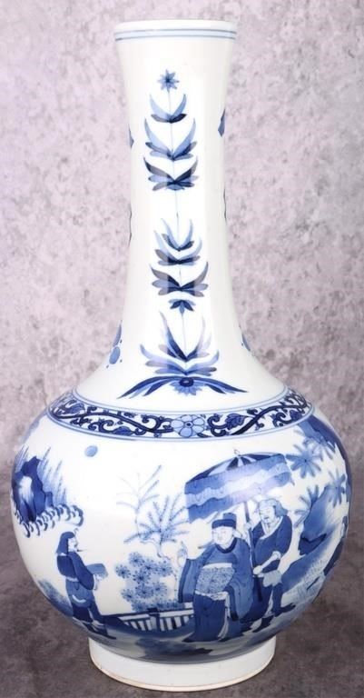 Antique Chinese Chongzen blue and white porcelain vase depicting a Chinese royalty scene. Vase is in the traditional & quot;tianqiuping& quot; shape with Chinese reign marks on the bottom.