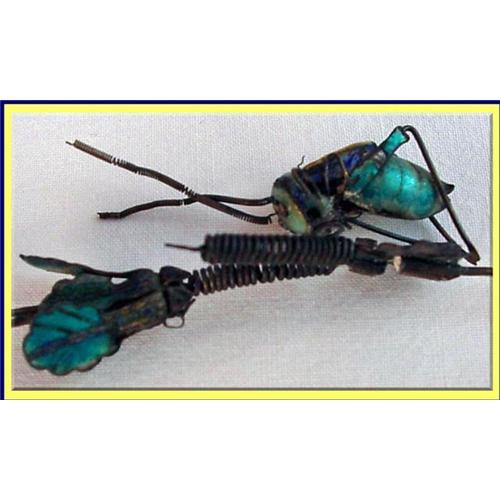 Fantastically crafted cricket, perched on a little wire, crawls towards a beautiful enamel flower, with long stamen ending in little wire-enclosed beads. The flower is attached to springs, so it bounces and quakes as the wearer moves her head (or from the slightest breeze). We believe there were originally two flowers, but the piece is very old and some allowances have to be made. Besides darkening of the silver caused over many years, the enamel and other parts are in good condition (see 'photos with all details enlarged).