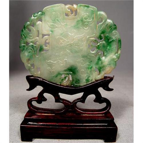 Antique, Qing Dynasty, Chinese oval green jade plaque. Details: carved in relief with the Luohan figure, the reverse with flowering branches bordered above by a bat?s face and mounted in the wooden stand. Dimensions without the frame: 7cm x 5,8cm (13 ¾ x 8 ¾ inches). Height with the stand: 9,5cm (3 ¾ in).
