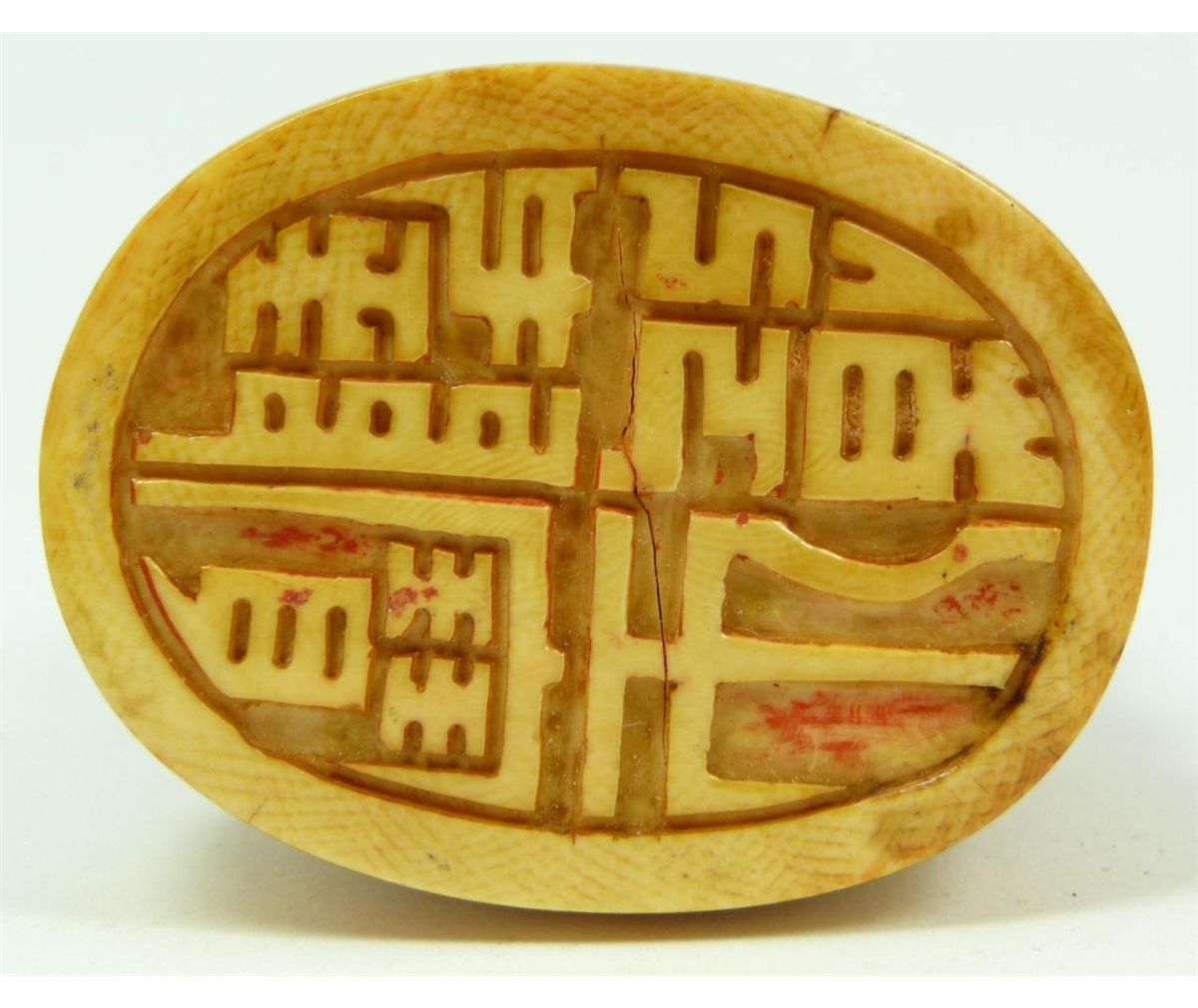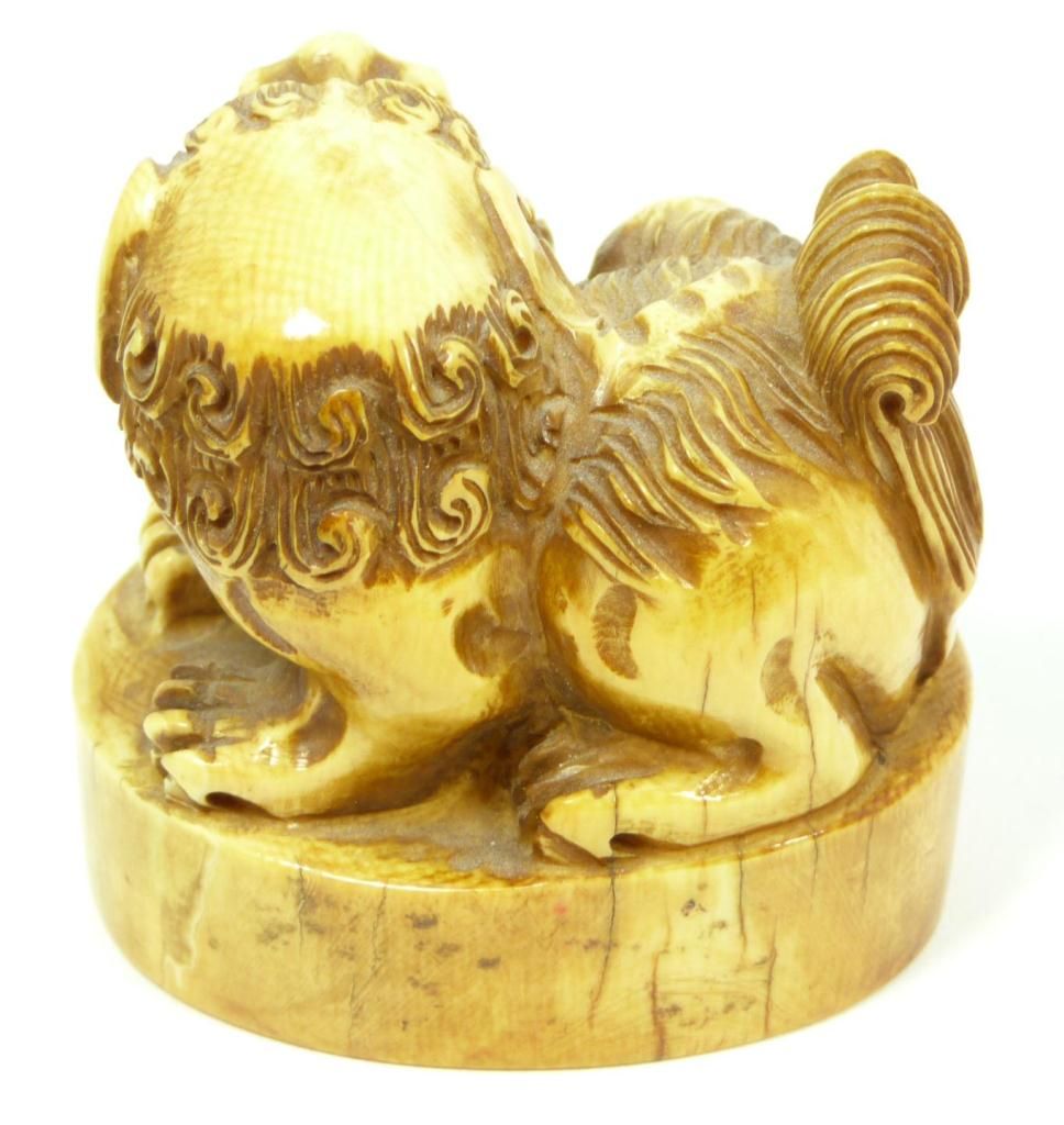 Antique Chinese hand carved ivory figural foo lion seal. Bottom holds relief four character calligraphy marks. Mid to late Qing dynasty period. Measures 2 3/8" height x 2 3/8" length x 1 3/4" depth (6cm x 6cm x 4.4cm). Total ivory weight of 136 grams.