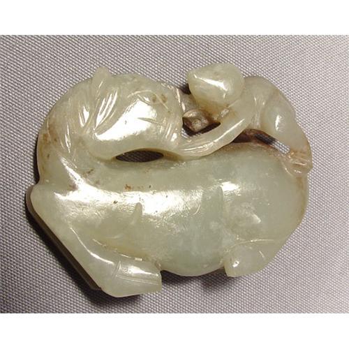 Antique, 19th century, Qing Dynasty, pale celadon jade group carving of a monkey clambering on the back of a horse. Dimensions; length: 6, 5cm (2 ½ in), height: 5cm (2in).