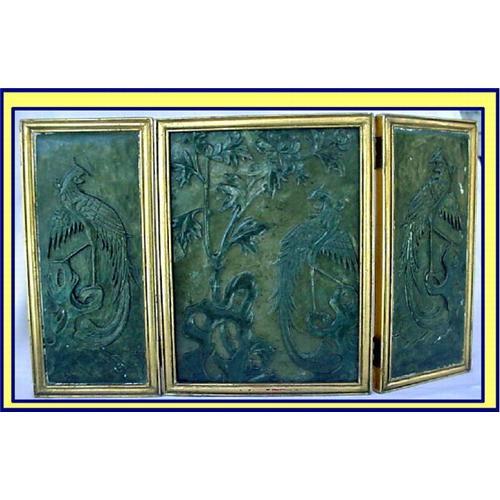 Jade / jadeite. Pair of 3 panel carved table screens probably.<BR>Total measurements when unfolded:20 1/4 inches wide X 11 3/4inches high.<BR>A central jade panel flanked by two side faux stone wood-carved panels. Each panel contains a plaque with a carved phoenix bird in naturalistic surroundings. The central jade panel can be slid in and out - the gilt wood frame is not sealed. Frames joined by hinges - all in good condition.<BR>One central panel has a flaw across it, near the top. It does not detract from the plaque, but appears to be a natural part of the jade.