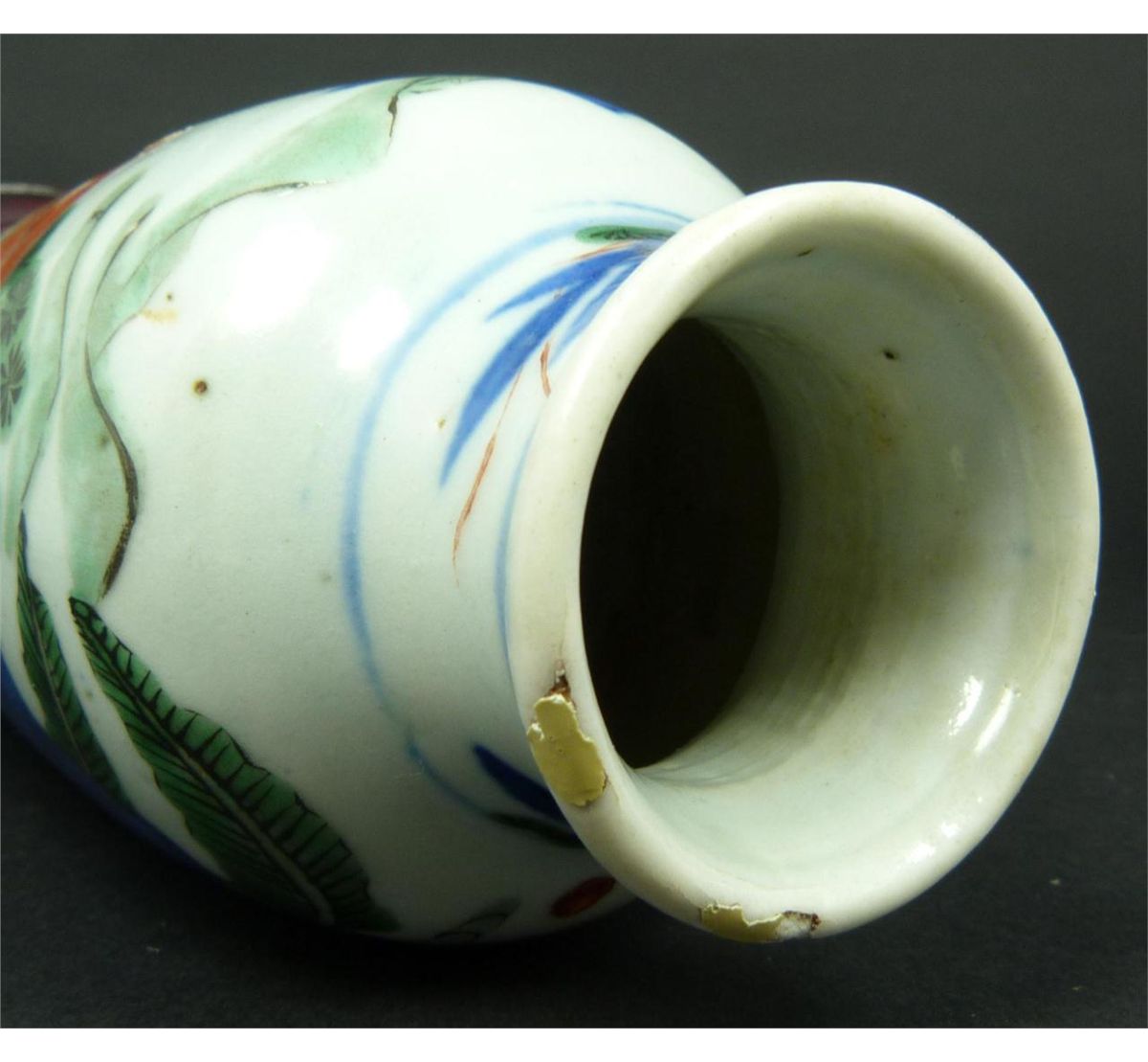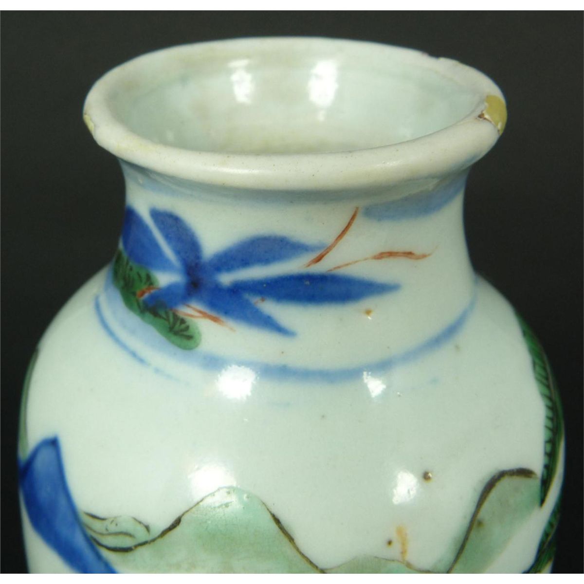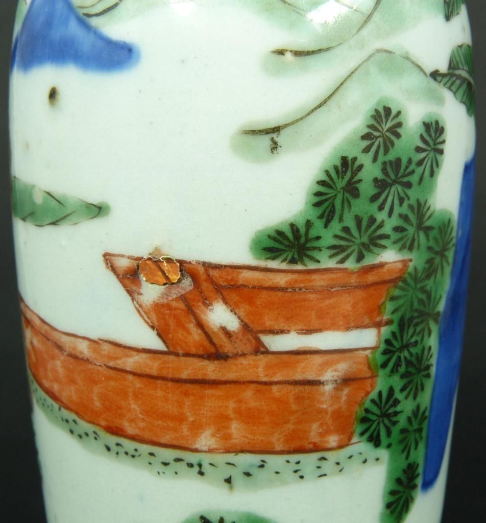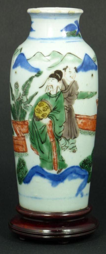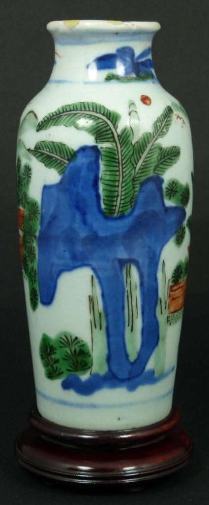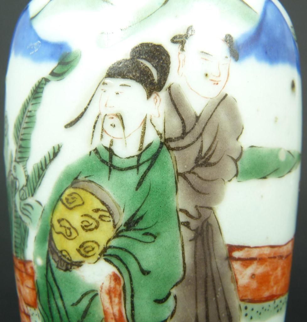 19th century Chinese hand painted porcelain vase depicting a courtyard scene with wise man and attendant. Qing dynasty period. Includes fitted wooden base. Measures 6 7/8" height + 7/8" base height (17.4cm + 2.2cm). Total weight of 584 grams.