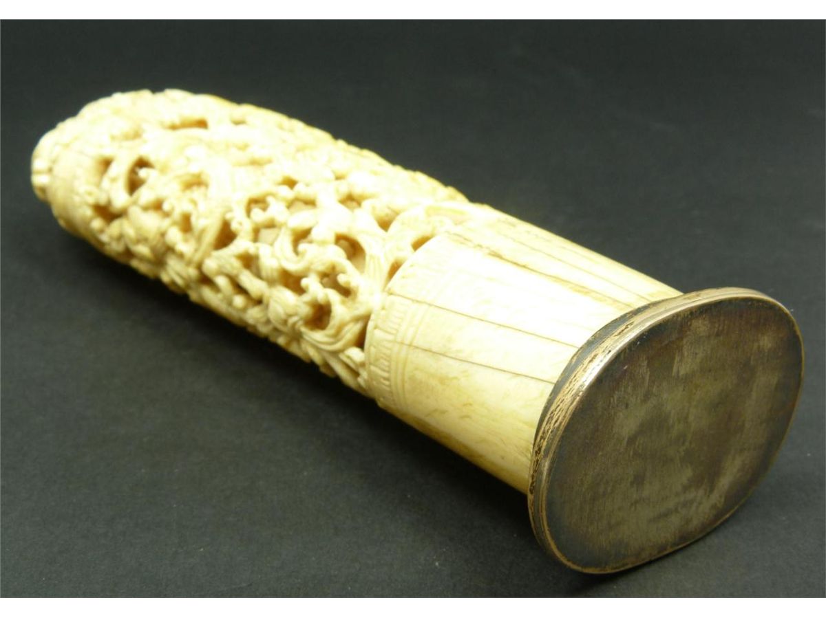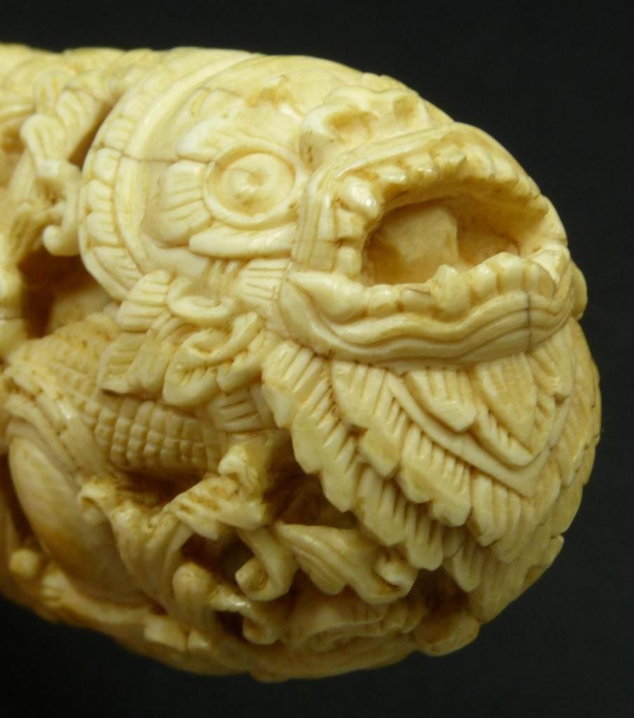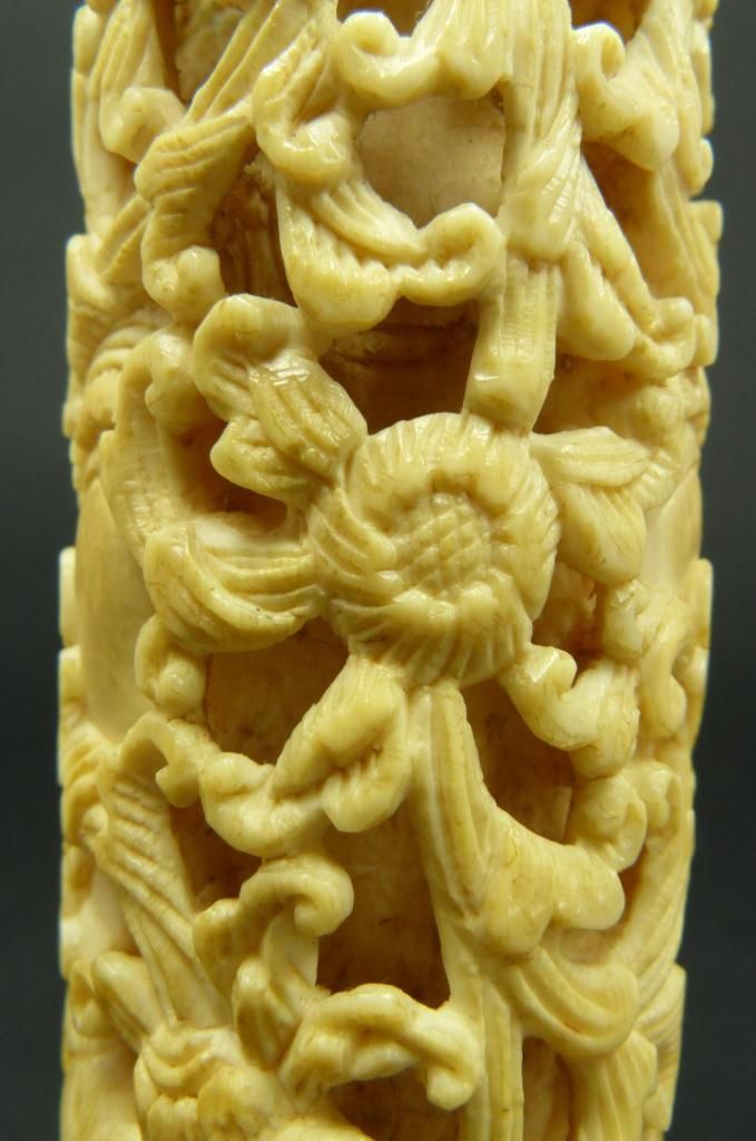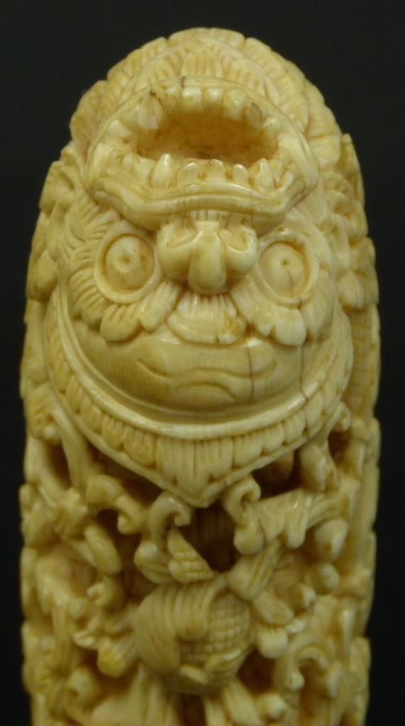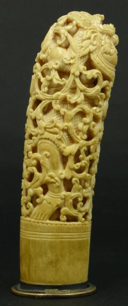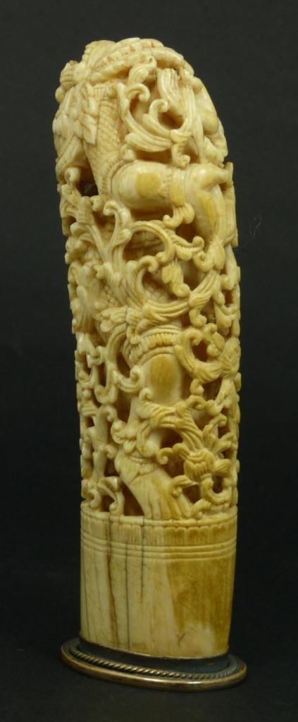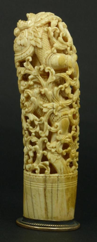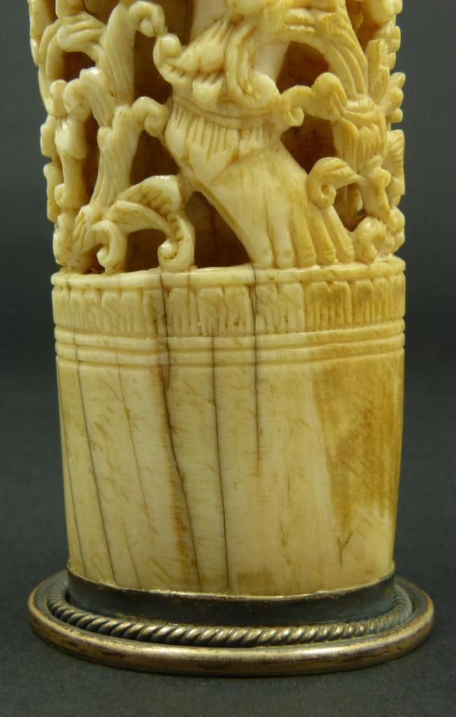 Antique Chinese relief carved ivory study depicting a demon entrapped in scrolled floral vine designs. Has mounted silver base. Made Qing Dynasty. Measures 6 1/2" height (16.5cm). Total weight of 290 grams.