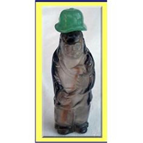 Classical Chinese carving in smoky quartz. One of two hehe erxian twin figural snuffs (the deities of Peace and Harmoney). Dressed in long, baggy clothes. Fine detail. The stopper is carved as a jade hat in the form of a green lotus flower, from which long strands of hair are carved.