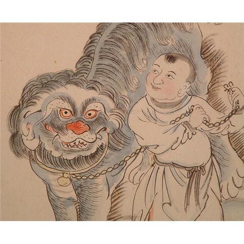 WONDERFUL WATERCOLOR OF A YOUNG BOY AND HIS FOO LION. NOT VIEWED OUT OF FRAME. A GREAT ADDITION TO A COLLECTION OR VERY COOL ON A WALL.
