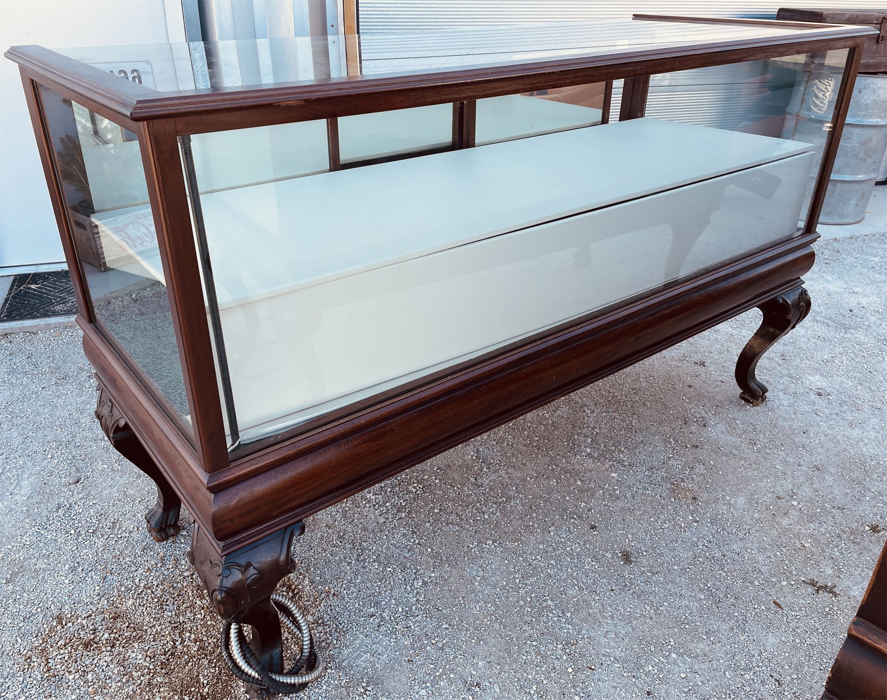 ANTIQUE CLAW FOOT STORE DISPLAY CASE - 27" D X 43" H X 72" L - WITH INTERIOR LIGHTING.