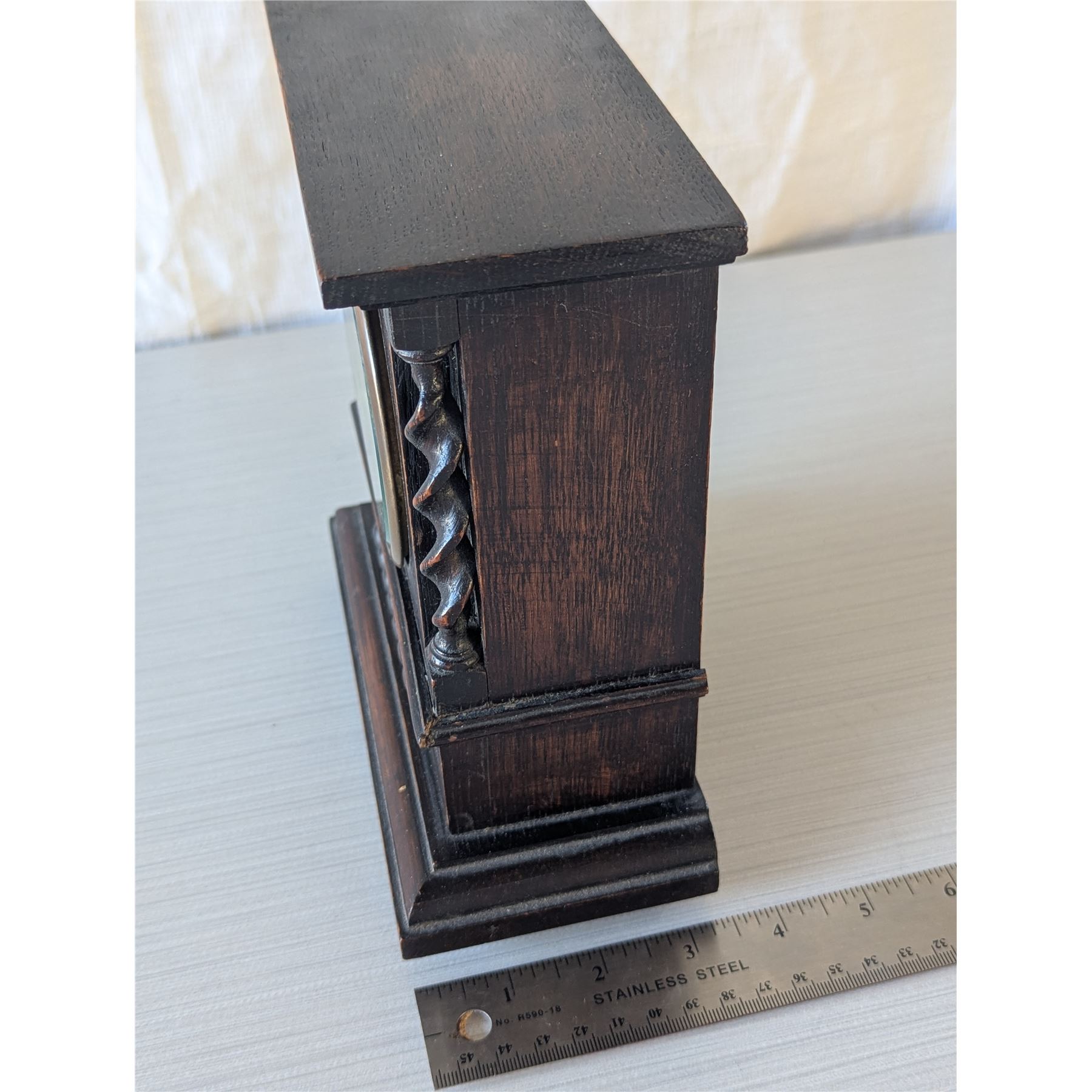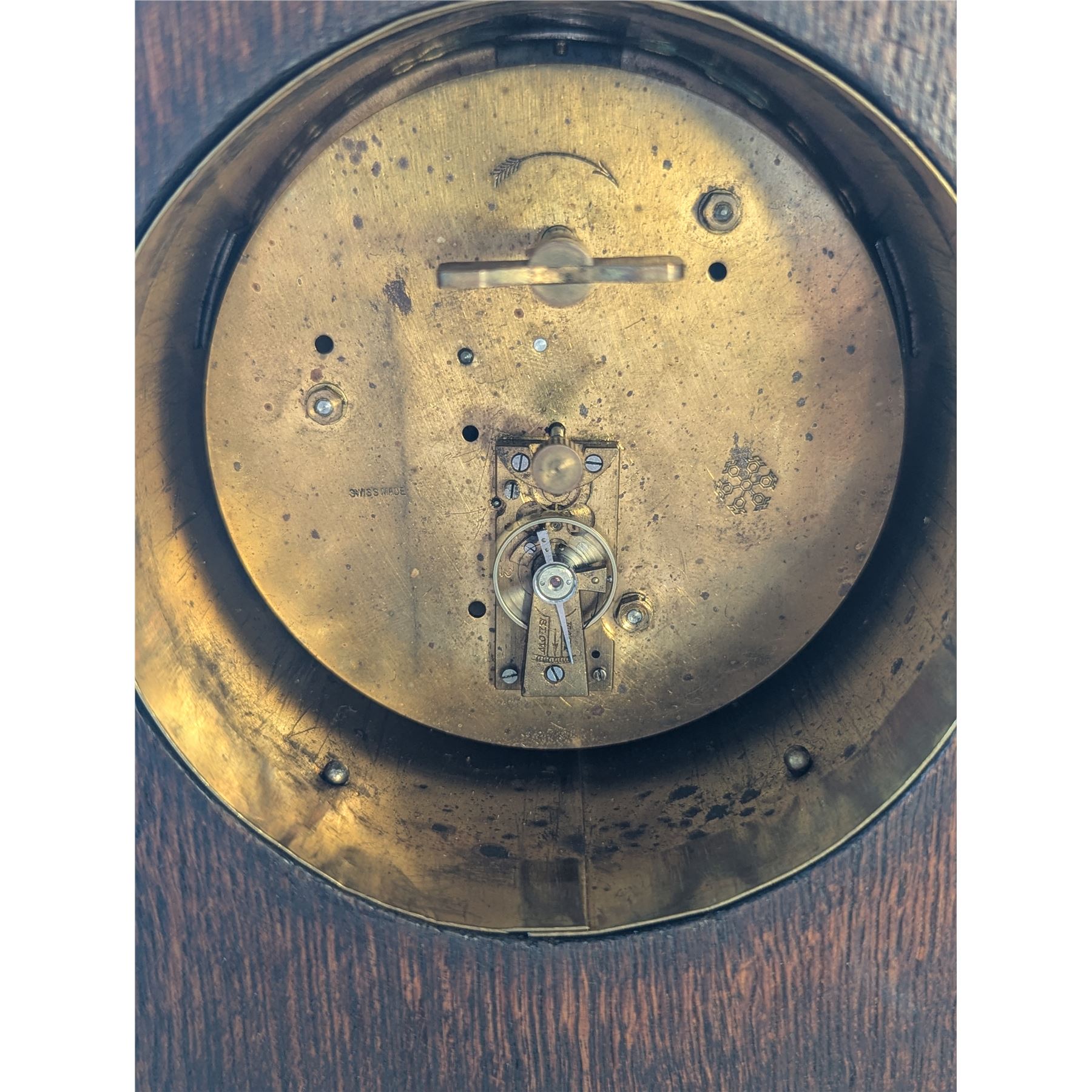 This SWISS made,dark oak clock is in excellent working condition. Stands 8" x 7.5" x 3.5". Brass workings inside