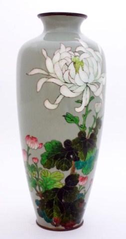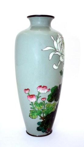 Approx. 9" tall. With multi colored flowers on a celadon green ground. Fabulous condition circa 1920's.