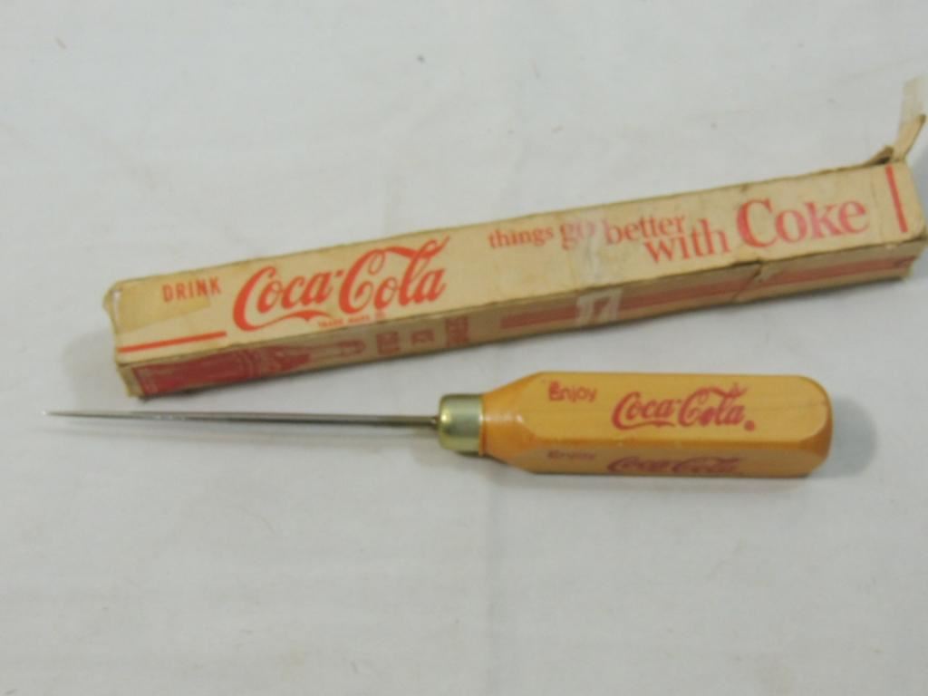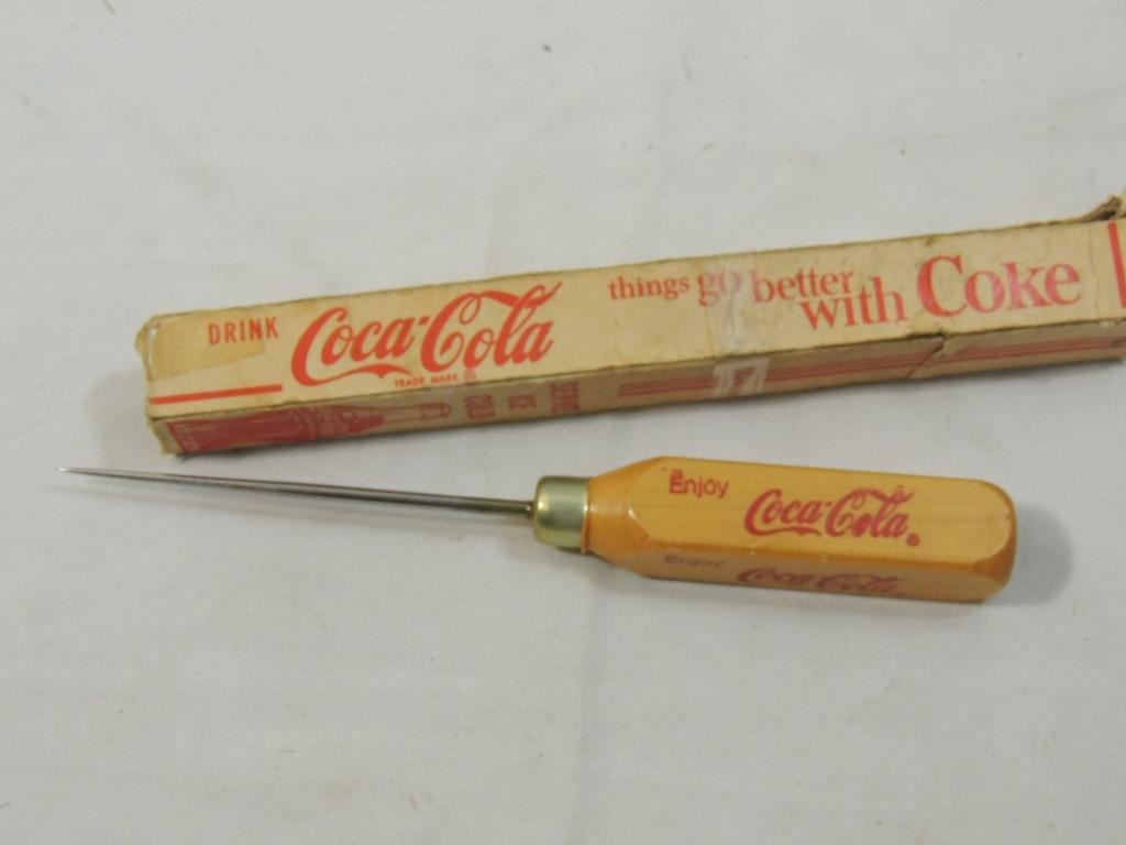 VINTAGE COCA COLA ICE PICK WITH ORIGINAL BOX, VINTAGE ANTIQUE WOODEN HANDLE ICE PICK COCA COLA MEMORABILIA AS SHOWN SEE PHOTO FOR MORE DETAILS.
