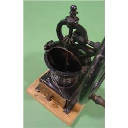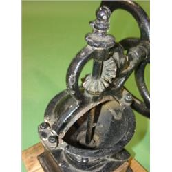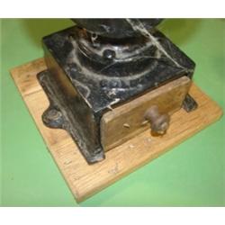 ANTIQUE COFFEE GRINDER. Single wheel. Replaced drawer. New wooden base. Missing cover for top. Has been overpainted with black paint. Wheel: 9.5" Dia.