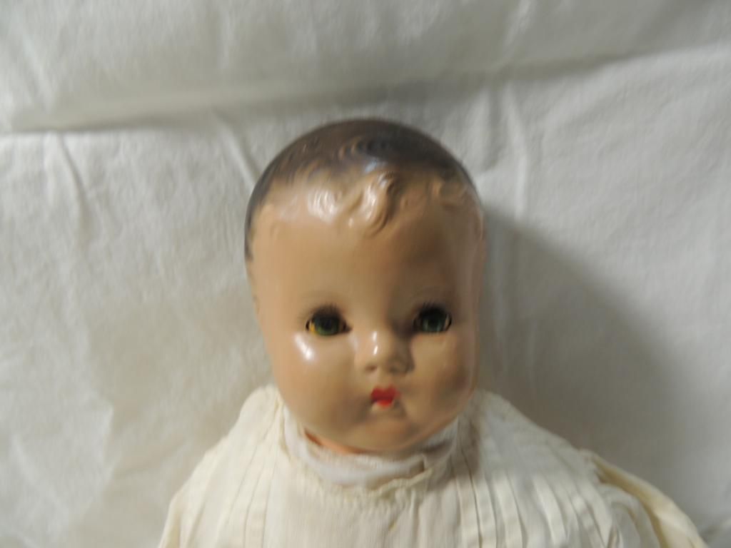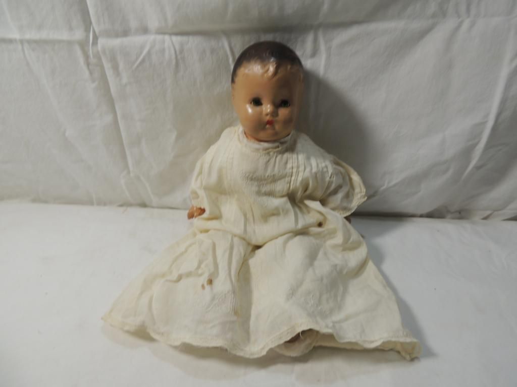 ANTIQUE COMPOSITION 16" DOLL SLEEP EYES. GOOD CONDITION. RARE COLLECTIBLE. COMPOSITION DOLL. COLLECTORS DREAM. BEAUTIFUL DRESS. AS SHOWN. SEE PHOTO FOR MORE DETAILS.