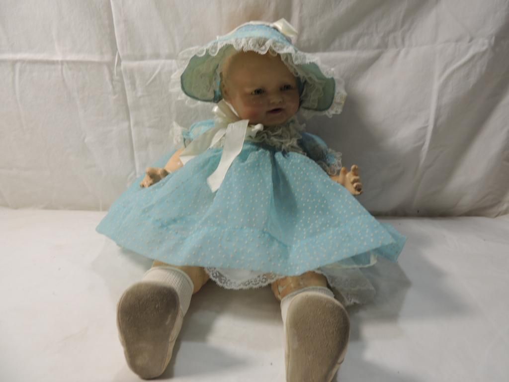 ANTIQUE COMPOSITION DOLL IN BEAUTIFUL BLUE DRESS AND BONNET. AS SHOWN. SEE PHOTO FOR MORE DETAILS.
