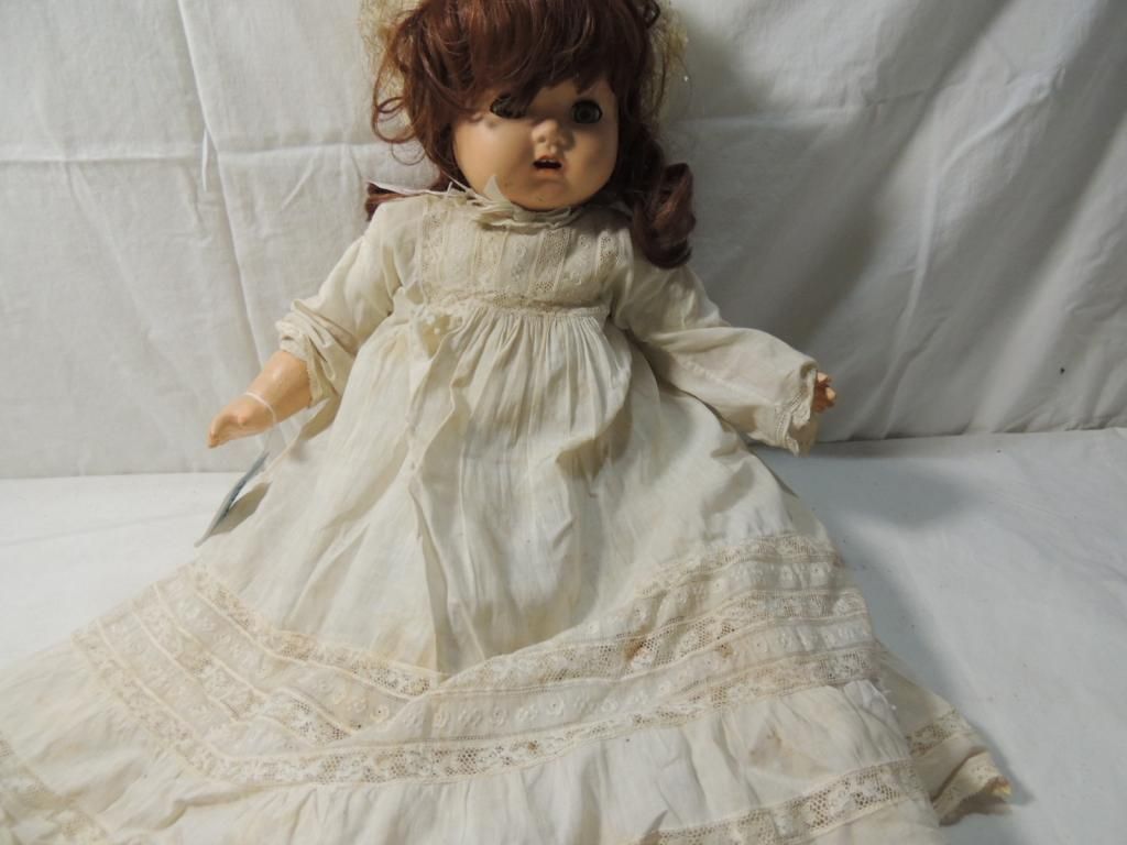 VINTAGE ANTIQUE COMPOSITION DOLL. GOOD CONDITION. SLEEP EYES. OPEN MOUTH. TEETH. LONG HAIR. AS SHOWN. SEE PHOTO FOR MORE DETAILS.