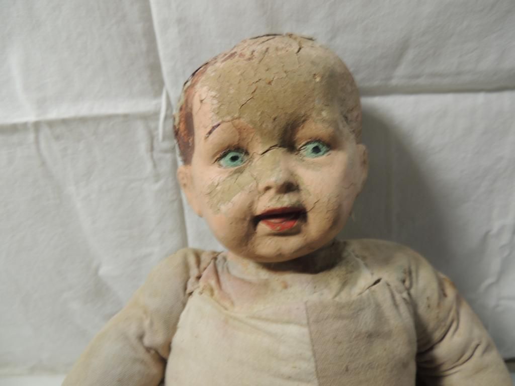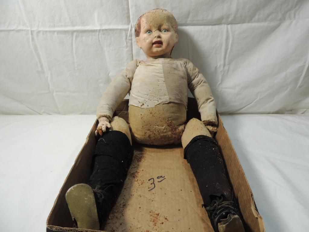 ANTIQUE COMPOSITION SAWDUST DOLL ANTIQUE DOLL. IN FAIR CONDITION FOR THE AGE 1800s? HAUNTED? AS SHOWN. SEE PHOTO FOR MORE DETAILS.