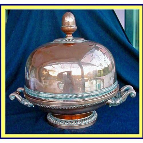 Round foot with gadrooned border. The bottom holds either coals or ice as a means of preserving the temperature and has a removable top. On either side are double Classically curved handles. Rims are gadrooned. The lid is a beautiful rich copper with sunburst apex on which is an acorn finial. Great patina. Looks fabulous on any dining table or sideboard.