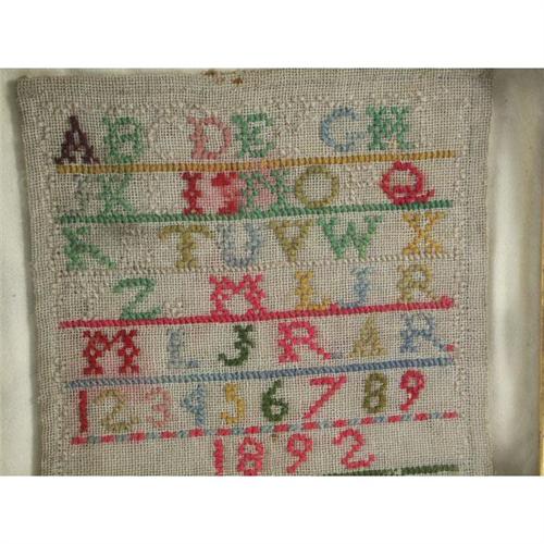 ANTIQUE CROSS STITCH: Antique cross stitch showing letters of the alphabet and an ''1892'' date. Floating presentation in a period Arts & Crafts oak cross corner frame with goldtone trim. Wear to cross stitch commensurate with its age. Some discoloration. Frame as seen to include chips to oak leaf insets and overall wear. 7'' x 7.5''/ 14'' x 16'' framed (at widest points).