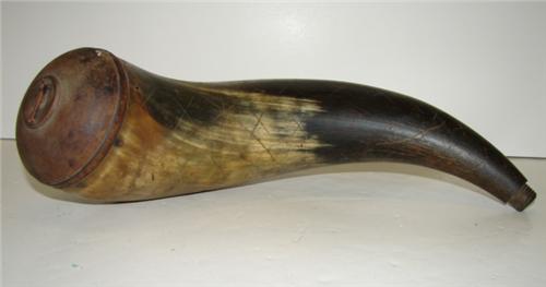 ANTIQUE DECORATED SCREW-TIP POWDER HORN. Incised “X” decoration. 13.5” L.