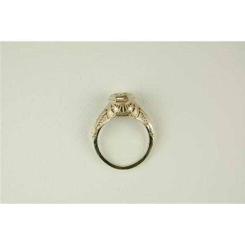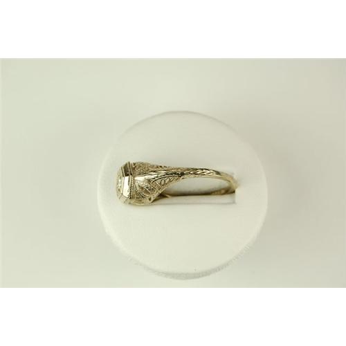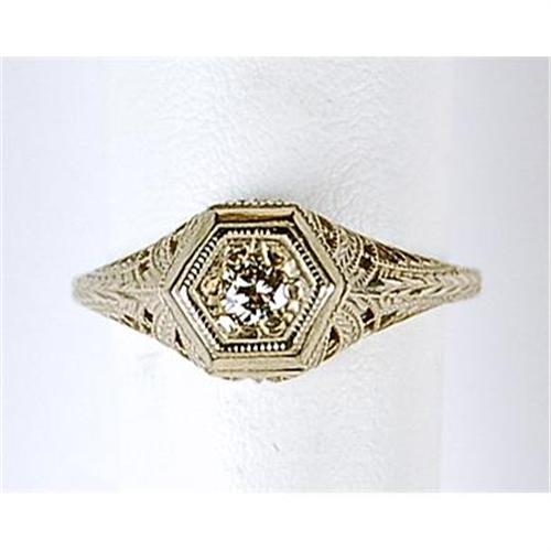 14k White Gold Vintage Engagement ring, circa 1935, featuring a Mine Cut Diamond = .20 CARATS! The Diamond is surrounded by exquisite filigree work. This ring is a Size 7 and I can easily resize it for you.