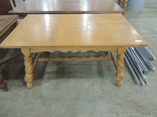 NICE NICE TABLE WITH UNIQUE LEGS PATTERN, AND TABLE TOP PATTERN. 59" X 36" X 30" PLUS TWO PULL OUT LEAVES. AS SHOWN.