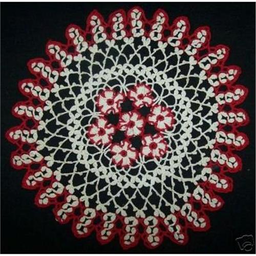ANTIQUE DOILIE - ABSOLUTELY BEAUTIFUL - HAND MADE - APPEARS TO BE COTTON.  FLOWERS IN CENTER. THIS DOILY IS IN BEAUTIFUL CONDITION - ESTATE FIND - POSSIBLY FROM THE 1930'S-1940'S +/-. COLORS ARE RED & OFF WHITE.