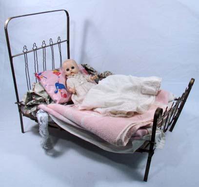 ANTIQUE DOLL BED WITH DOLL - Approx. 18" long, 10" wide and 15" tall.