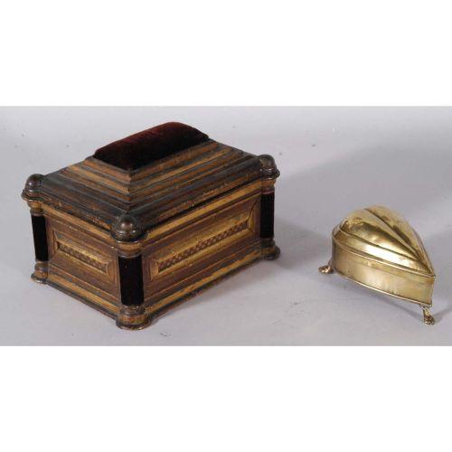 ANTIQUE DUTCH BRASS FOOTED BOX 18th century, 5 1/2" long, together with a Victorian inlaid jewelry box, 9 1/2", CONDITION REPORT: Dutch box with resoldered legs, PACKING AND SHIPPING: Fairfield Auction will provide packing and shipping (excluding insurance) within the Continental U.S. for $30. Buyer is welcome to use any other service or pick-up at the gallery.