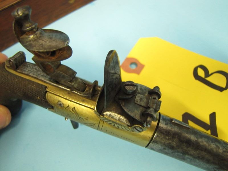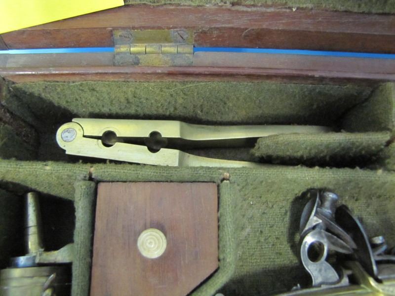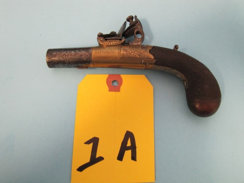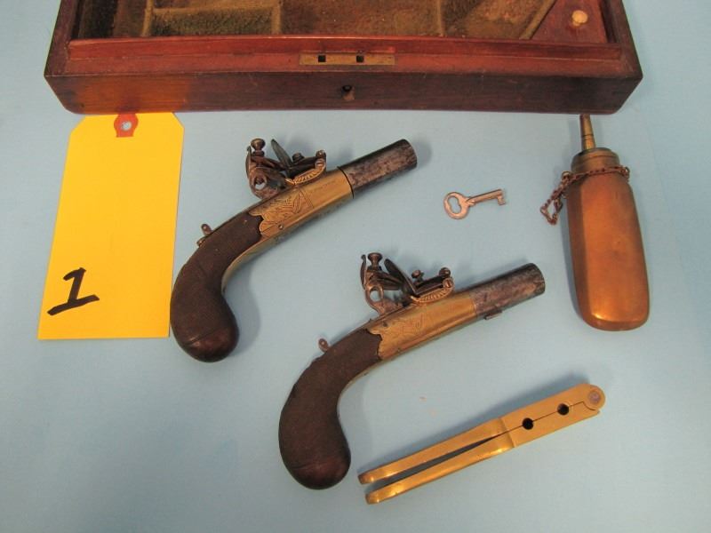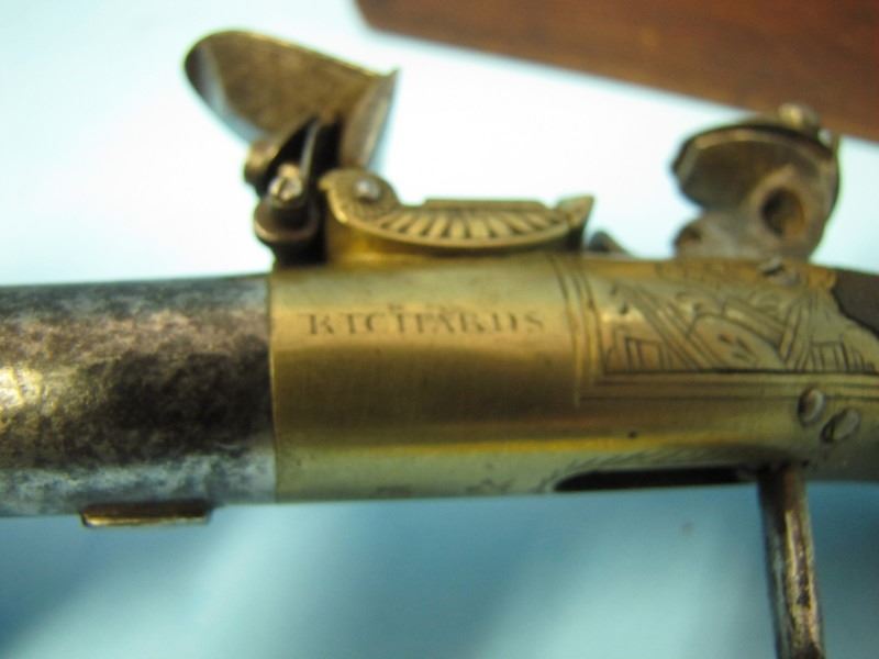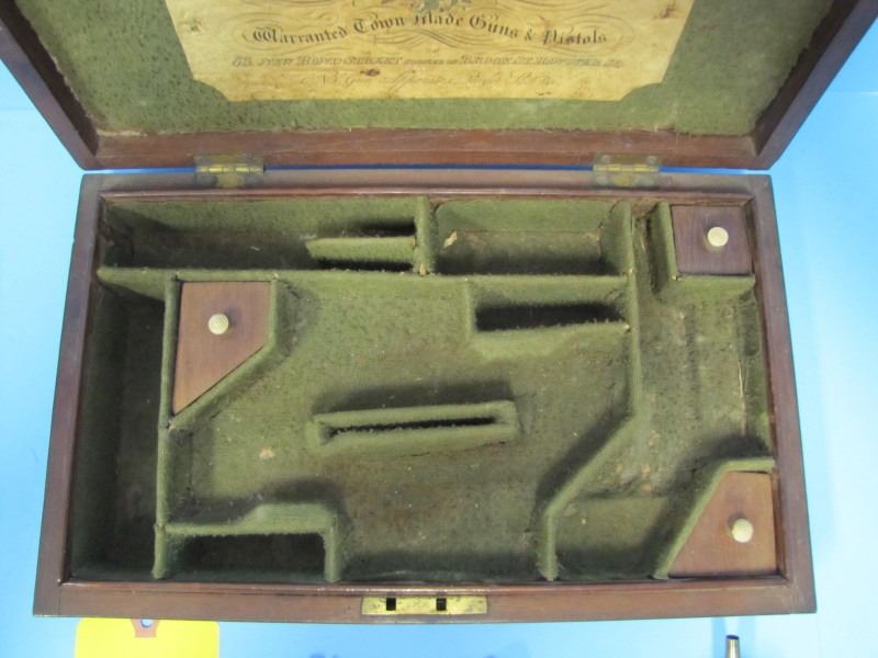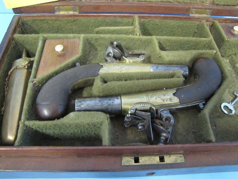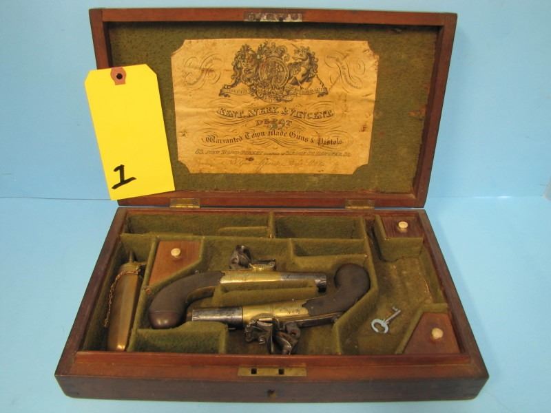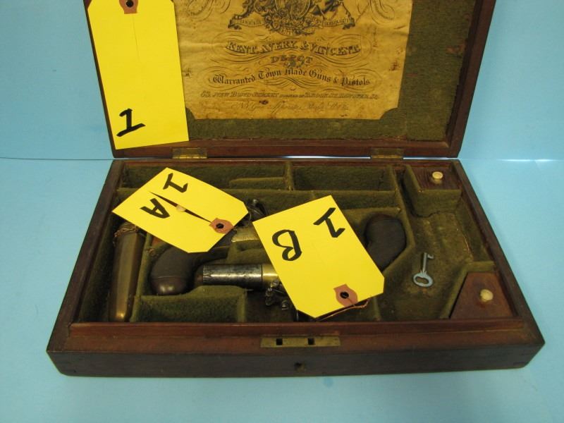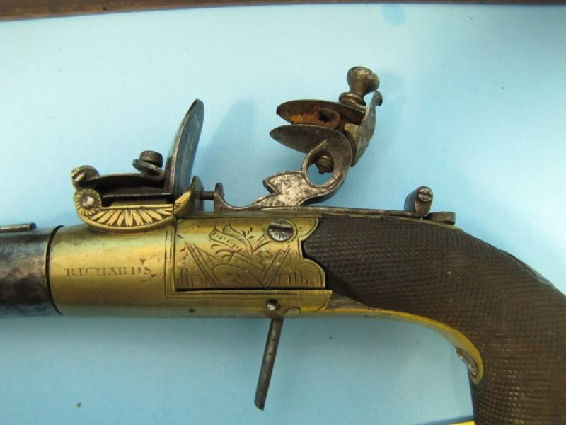 Dueling Pistol Set of 2 Richards single shot boxlock, approx .45 cal with folding triggers. In named case with accessories. PISTOL 1A: looks to be in decent shape, action works as it should. PISTOL 1B: some chips of wood missing from grip on right and left hand sides, barrel is not screwed on properly, screw probably replaced on grip, action works as it should. SEE PICTURES.