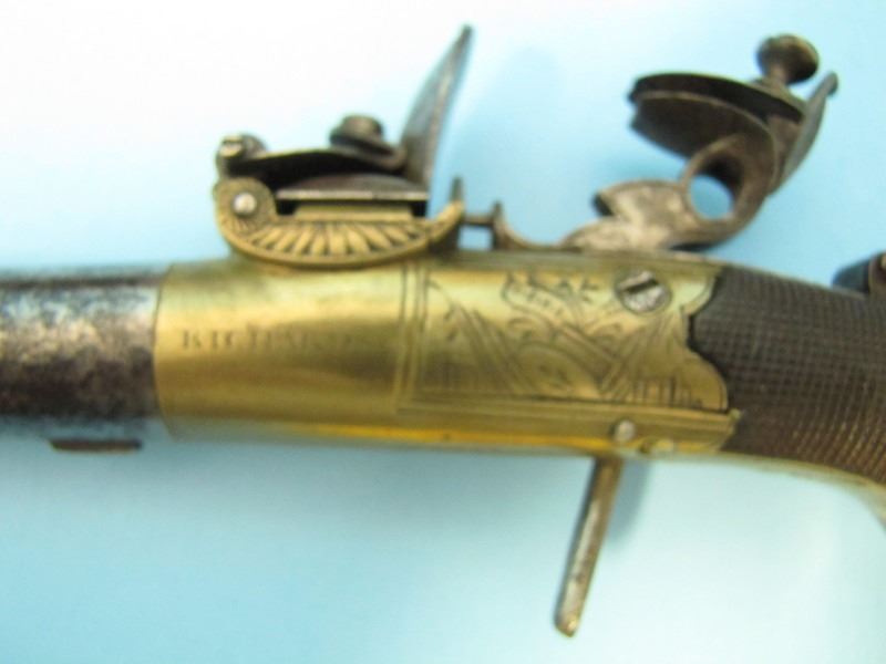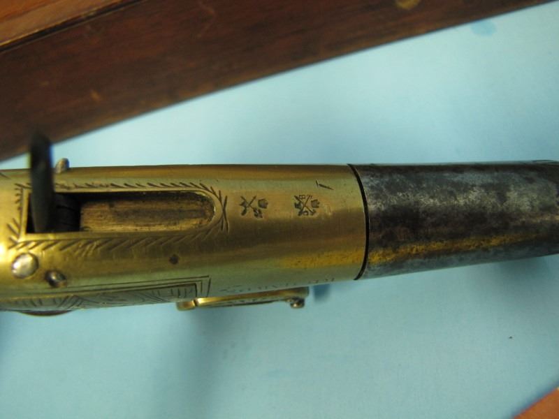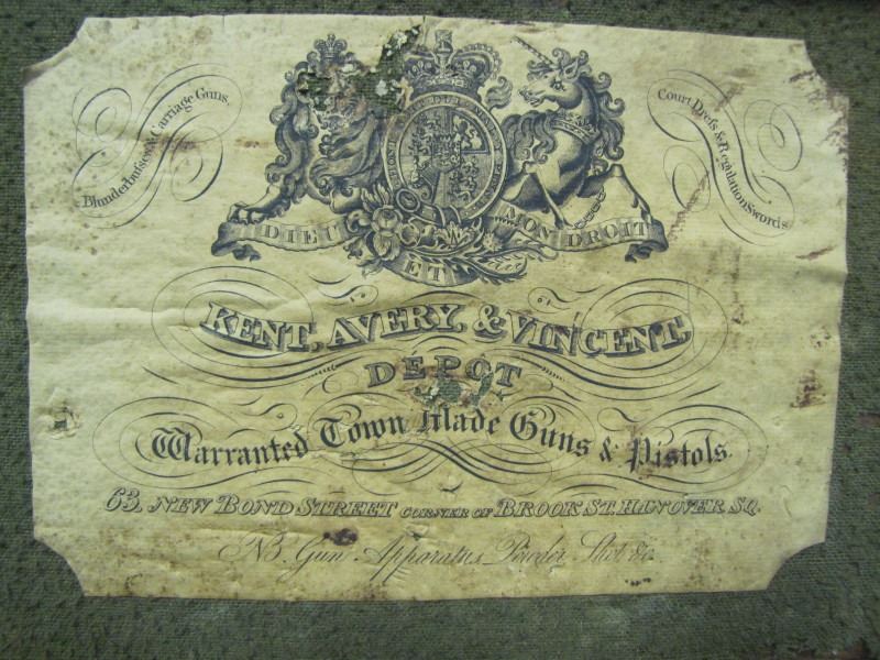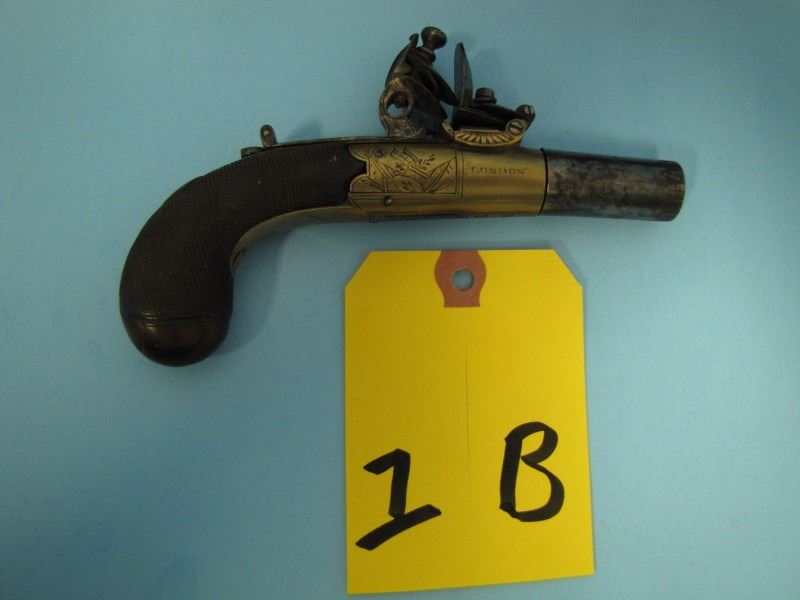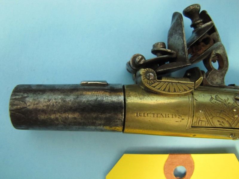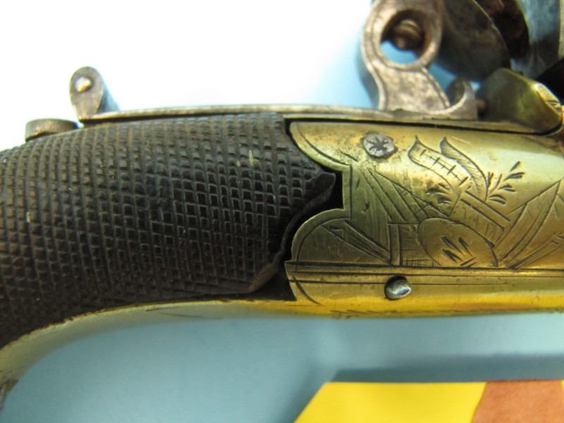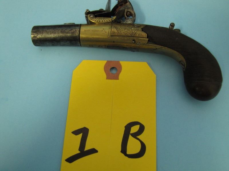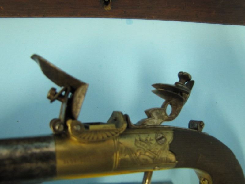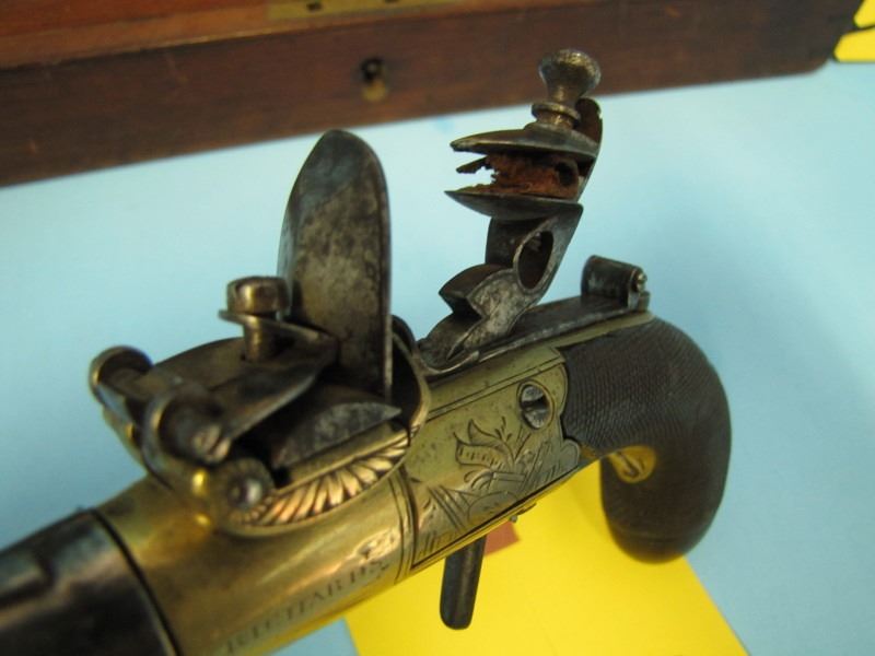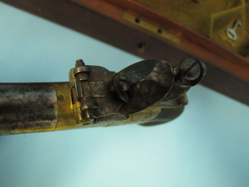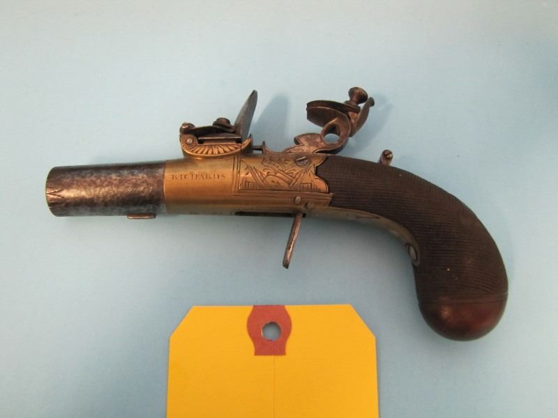 Dueling Pistol Set of 2 Richards single shot boxlock, approx .45 cal with folding triggers. In named case with accessories. PISTOL 1A: looks to be in decent shape, action works as it should. PISTOL 1B: some chips of wood missing from grip on right and left hand sides, barrel is not screwed on properly, screw probably replaced on grip, action works as it should. SEE PICTURES.