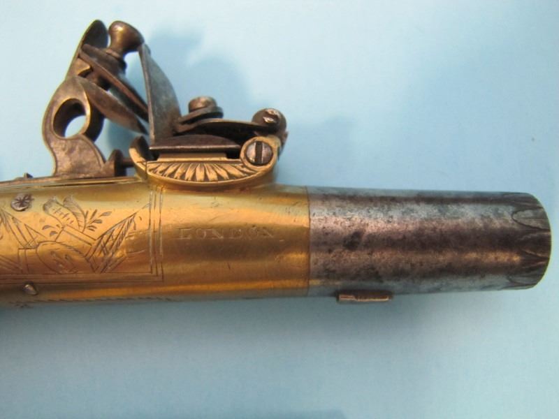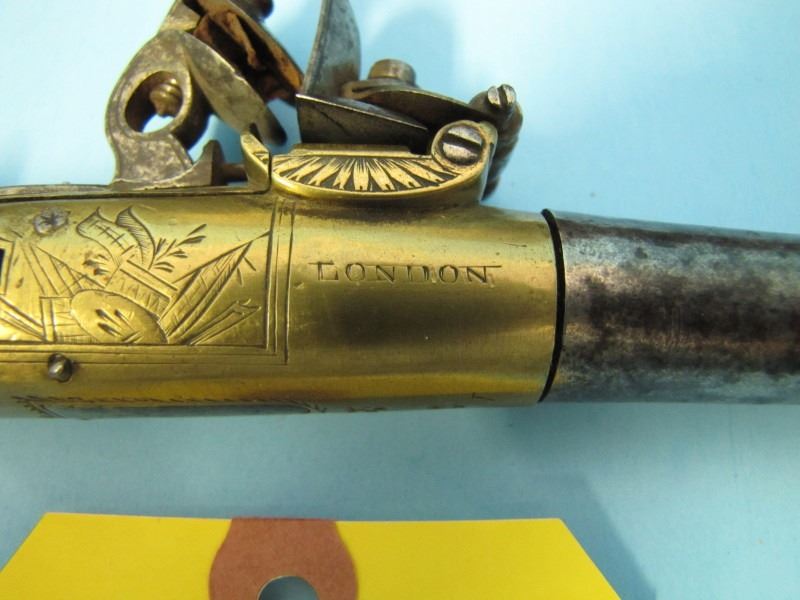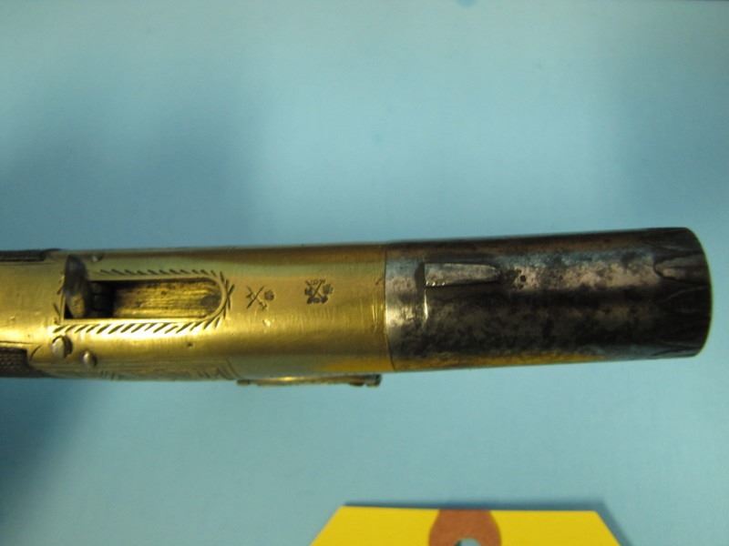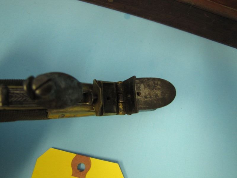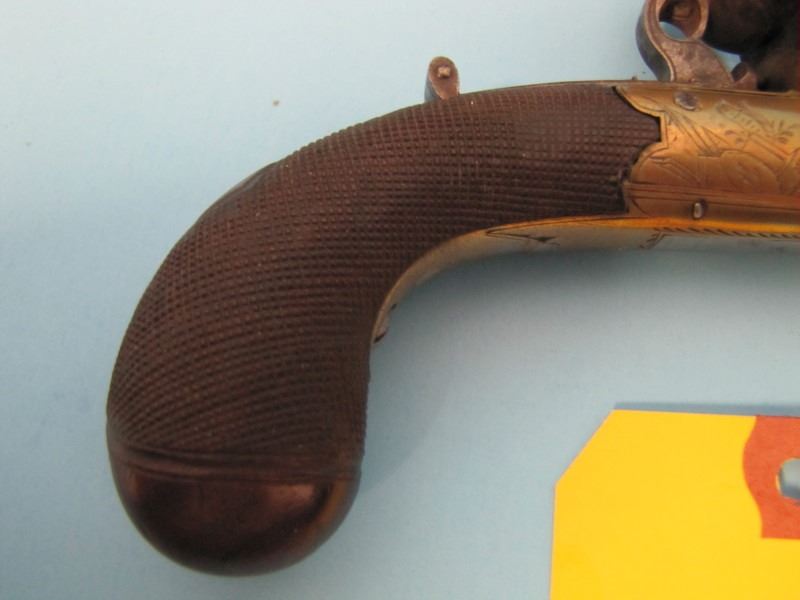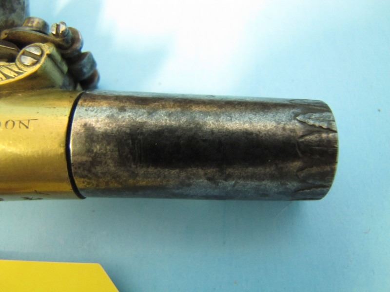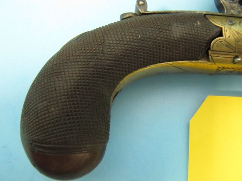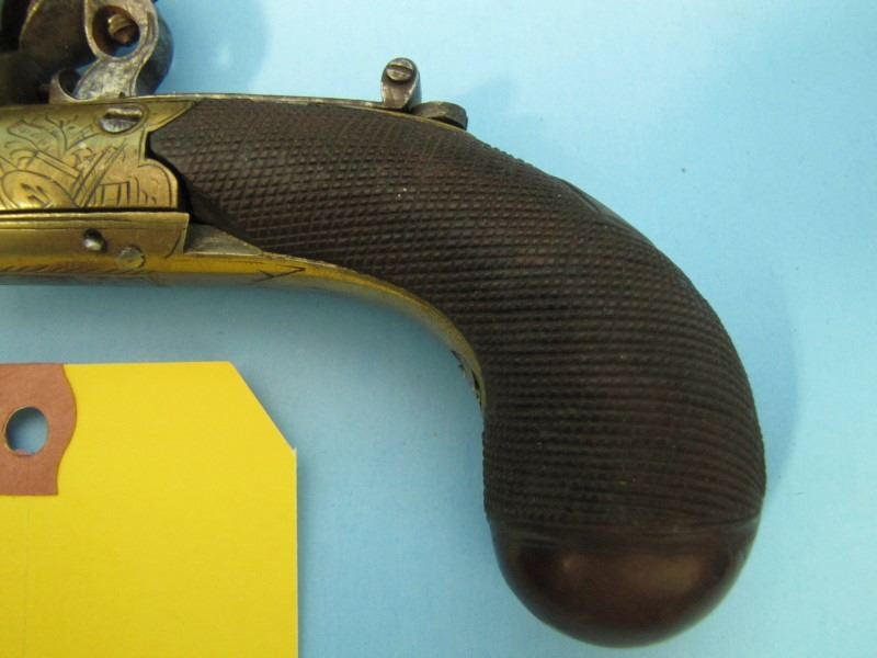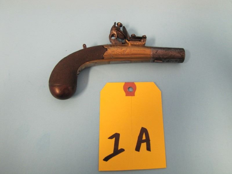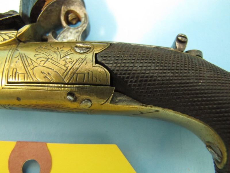 Dueling Pistol Set of 2 Richards single shot boxlock, approx .45 cal with folding triggers. In named case with accessories. PISTOL 1A: looks to be in decent shape, action works as it should. PISTOL 1B: some chips of wood missing from grip on right and left hand sides, barrel is not screwed on properly, screw probably replaced on grip, action works as it should. SEE PICTURES.