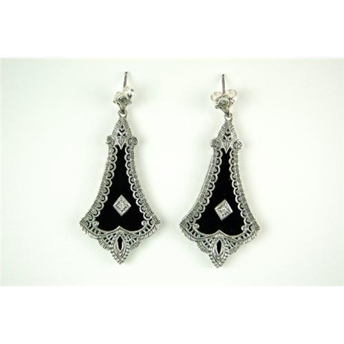This Stunning Pair of Black Onyx Earrings is an Authentic & Accurate copy of the filigree style of the 1920'S. They are STERLING Silver dangling earrings featuring a Black Onyx with a center Diamond surrounded by the most beautiful filigree work. They are 1 1/2" in length with post style backs.