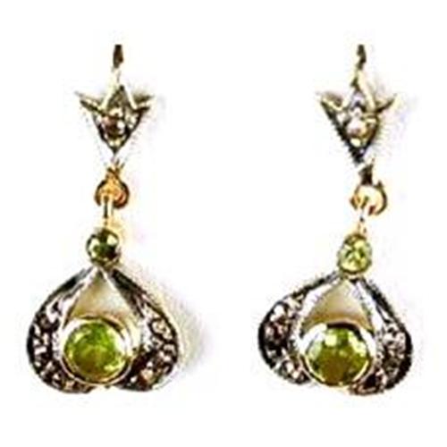 This pair of ANTIQUE Style Earrings are an AUTHENTIC and ACCURATE copy of a pair Round PERIDOT accented by Rose Cut DIAMONDS, and suspended from 14K GOLD Earwires. The Earrings measure 1.25" from the top of the Gold earwire to the bottom of the Earring.