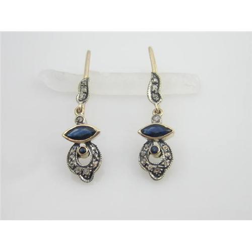 This pair of ANTIQUE Style Earrings are an Accurate and Authentic copy of a pair from the GEORGIAN Period CIRCA 1800 and they are in MINT condition. Dangling from the 14k Gold Earwires are a cluster of ROSE CUT DIAMONDS and a Marquise Cut BLUE SAPPHIRE with a smaller round SAPPHIRE as accent. The Rose Cut Diamonds and SAPPHIRE are Authentically set in Silver as is typical of Georgian Jewelry. They measure 1 1/2 inches from the top of the 14K Gold Earwire to the bottom of the dangle.