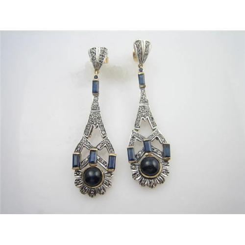 This pair of ANTIQUE Style Earrings are an Accurate and Authentic copy of a pair from the GEORGIAN Period CIRCA 1800 and they are in MINT condition. Dangling from the 14k Gold Posts are ROSE CUT DIAMONDS AND GENUINE BLUE SAPPHIRES. The DIAMOND TOTAL WEIGHT = .85 CARATS and the SAPPHIRE TOTAL WEIGHT = 6.50 CARATS!! The Rose Cut Diamonds and SAPPHIRES are Authentically set in Silver as is typical of Georgian Jewelry. They measure 2 1/4 inches from the top of the 14K Gold pOST to the bottom.
