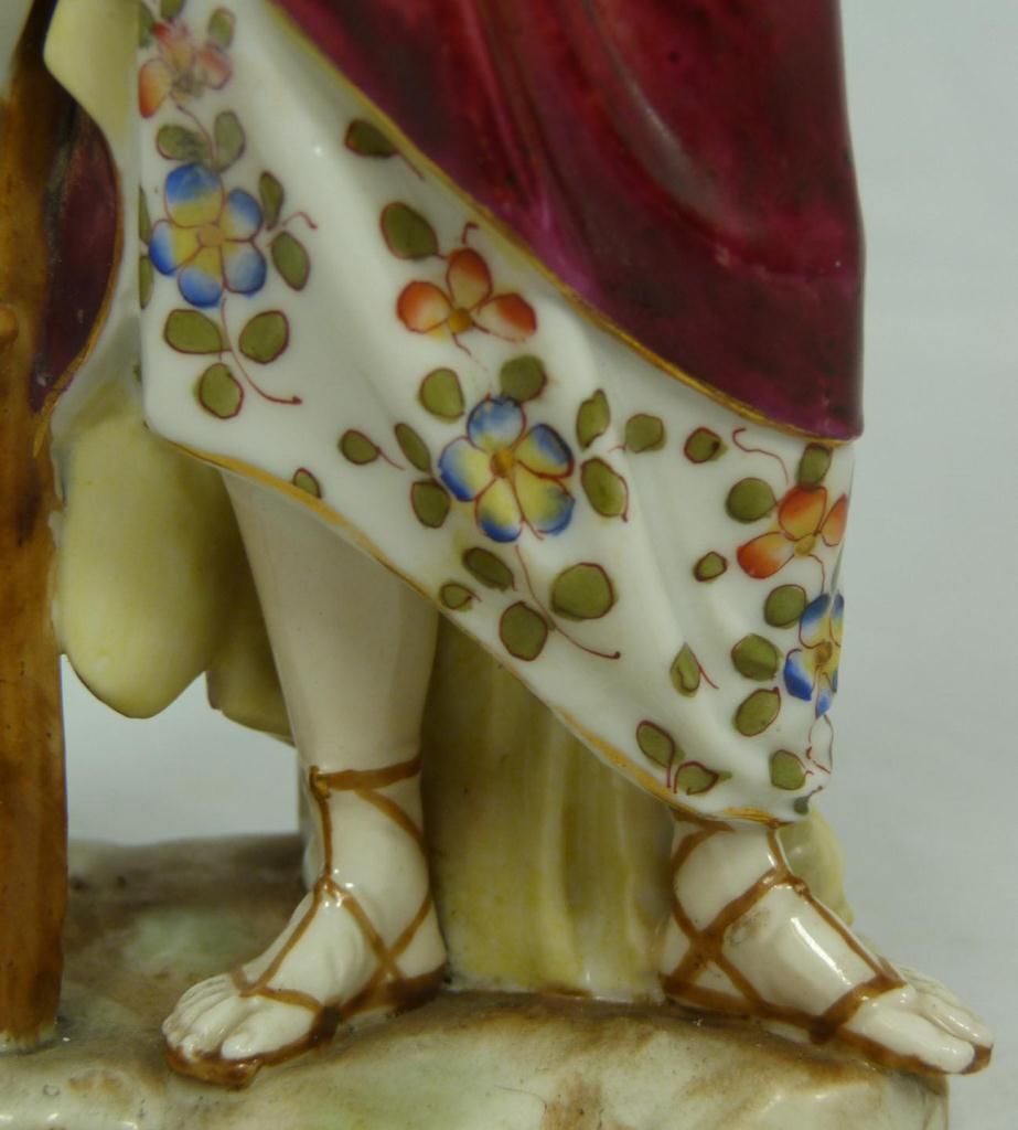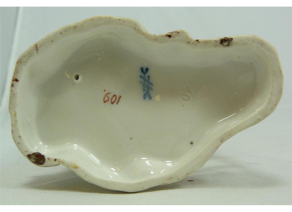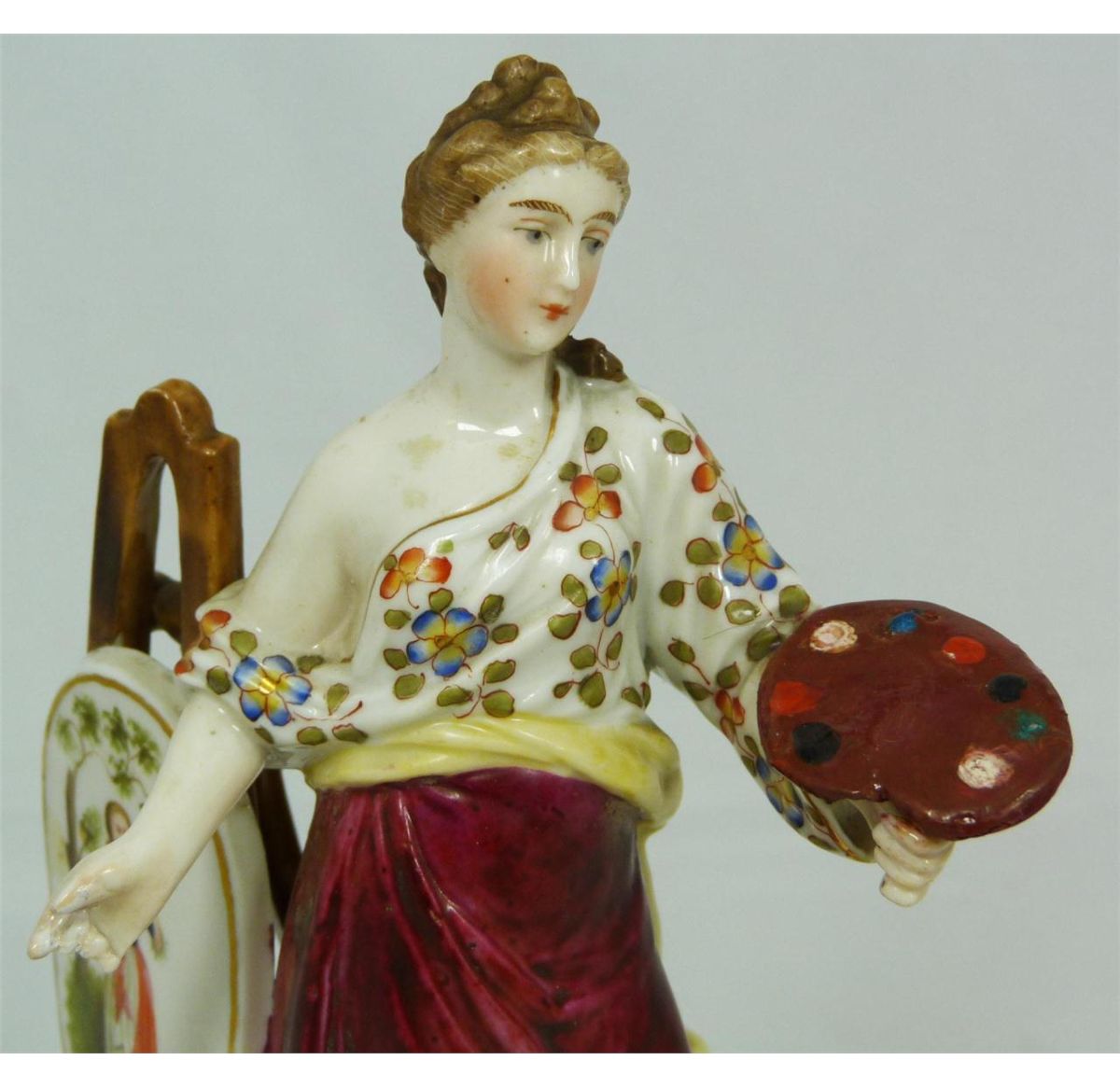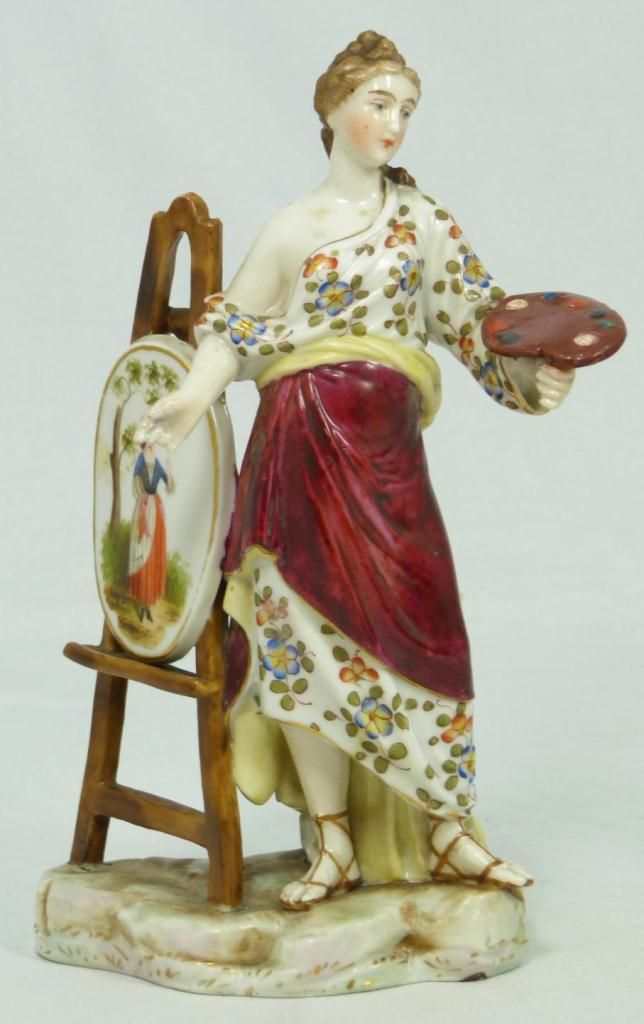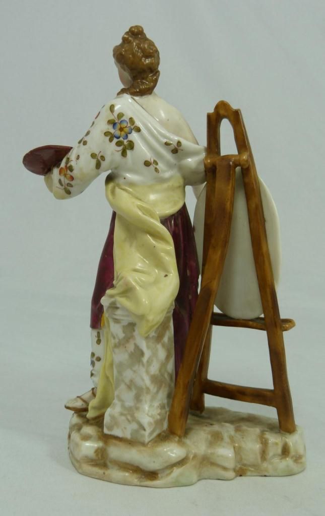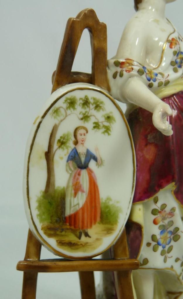 Antique Richard Eckert & Company Volkstedt / Rudolstadt German porcelain figure of painting woman. She is standing on earthform base next to easel with canvas depicting a woman. Holds blue underglaze hayforks mark to bottom. Holds impressed 40 and red enameled 109. 19th century. Measures 6 7/8" height (17.4cm). Total weight of 248 grams.