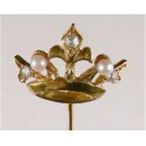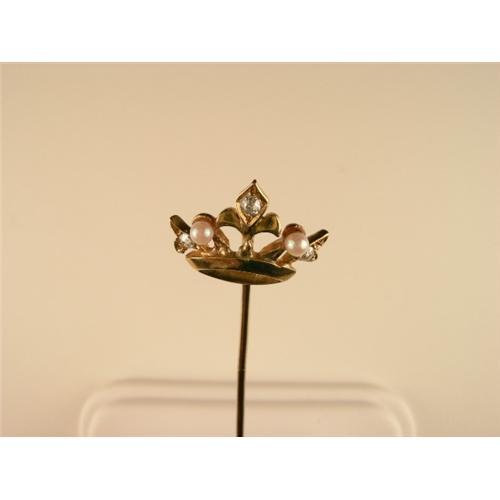 THIS ANTIQUE EDWARDIAN GOLD STICKPIN IS CIRCA 1890 AND IT IS IN EXCELLENT CONDITION! It is 14k Yellow Gold and it is in the shape of a CROWN. The Crown is set with 3 DIAMONDS with 2 CULTURED PEARLS as accent.