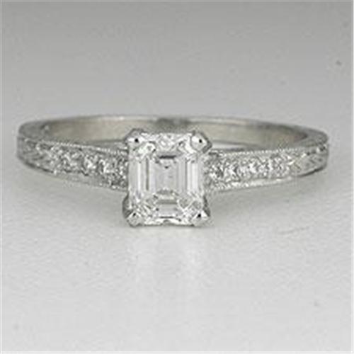 This ANTIQUE Style Engagement Ring features an EMERALD CUT DIAMOND = .58 CARATS! This Diamond is FINE 'G' Color and VERY FINE 'VS2' Quality. This Stunning PLATINUM setting is an EXACT REPLICA of an ORIGINAL ANTIQUE ENGAGEMENT RING. The Emerald Cut Diamond is set low in the ELEGANT PLATINUM mounting. The mounting also features 8 bead set DIAMONDS on the sides, with milgrained edges and a detailed design. The DIAMOND TOTAL WEIGHT = .66 CARATS! The ring is now a Size 5 3/4 and it can be resized either larger or smaller. It IS in MINT condition.